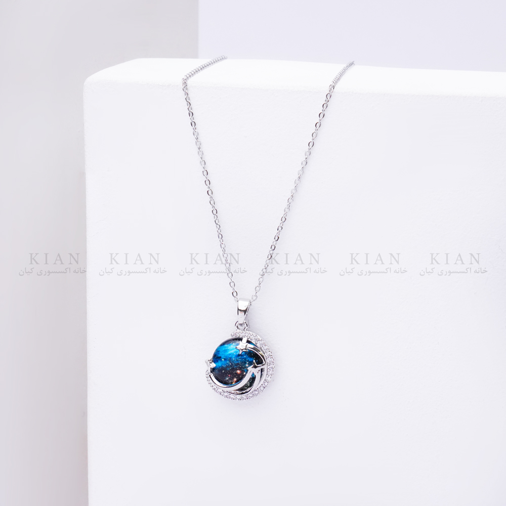 پلاک گرد این گردنبند با یک طرح سهبعدی شبیه موجهای دریا طراحی شده است. رنگ آبی درخشان در مرکز پلاک، جلوهای شیشهای و شفاف دارد که با کوچکترین حرکت، نور را به زیبایی بازتاب میدهد؛ درست مانند برق سطح آب در روزهای آفتابی. قاب نقره ای براق دور طرح، استایل مدل را کاملتر و لوکستر کرده است.