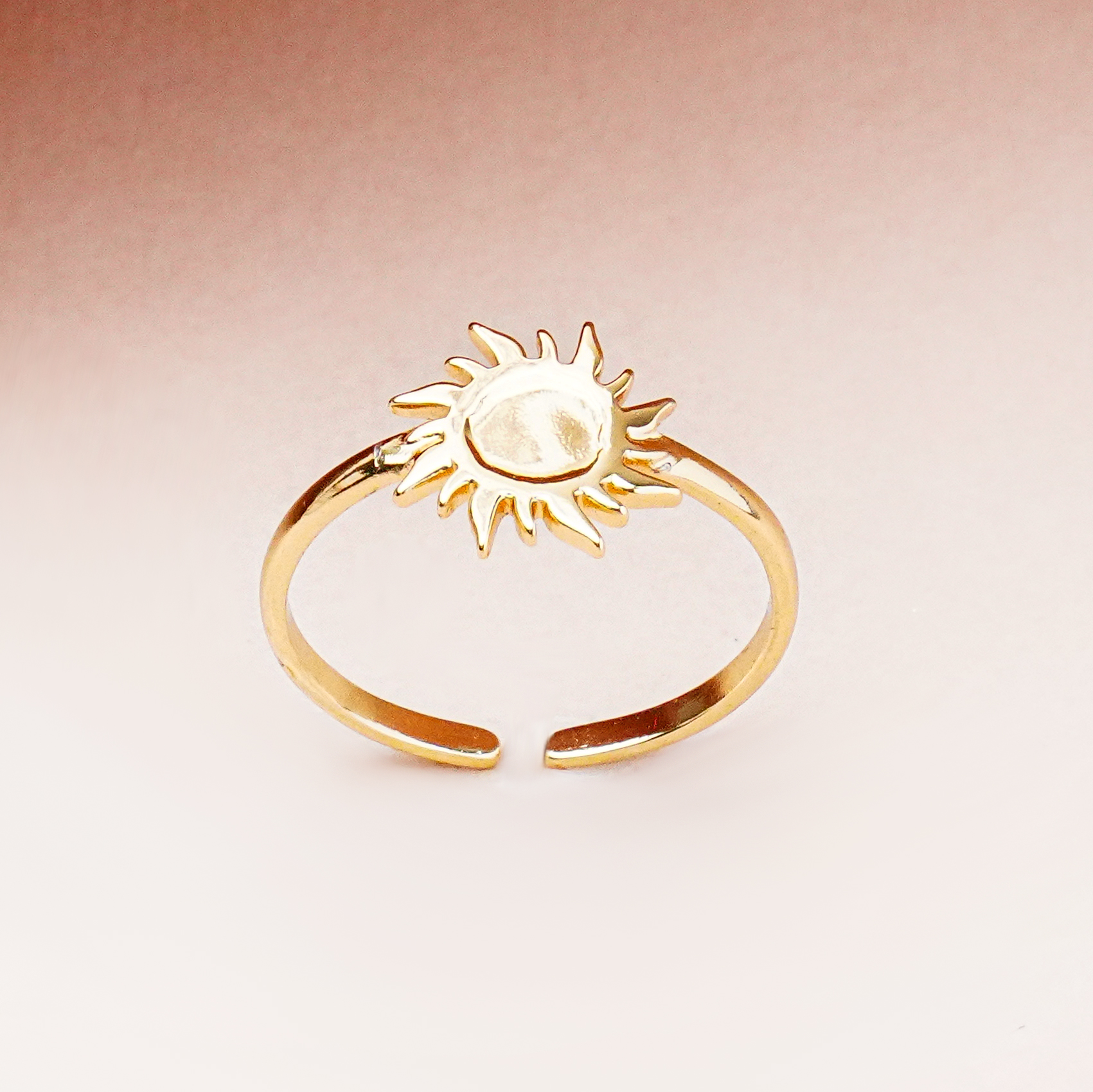 انگشتر خورشید درخشان با طراحی الهام‌گرفته از خورشید و جزئیات ظریف پرتوها، جلوه‌ای درخشان و چشم‌نواز به استایل شما می‌بخشد. فرم برجسته و طراحی دقیق این انگشتر باعث می‌شود روی دست به‌خوبی دیده شود و حس انرژی، شادی و جذابیت را منتقل کند.