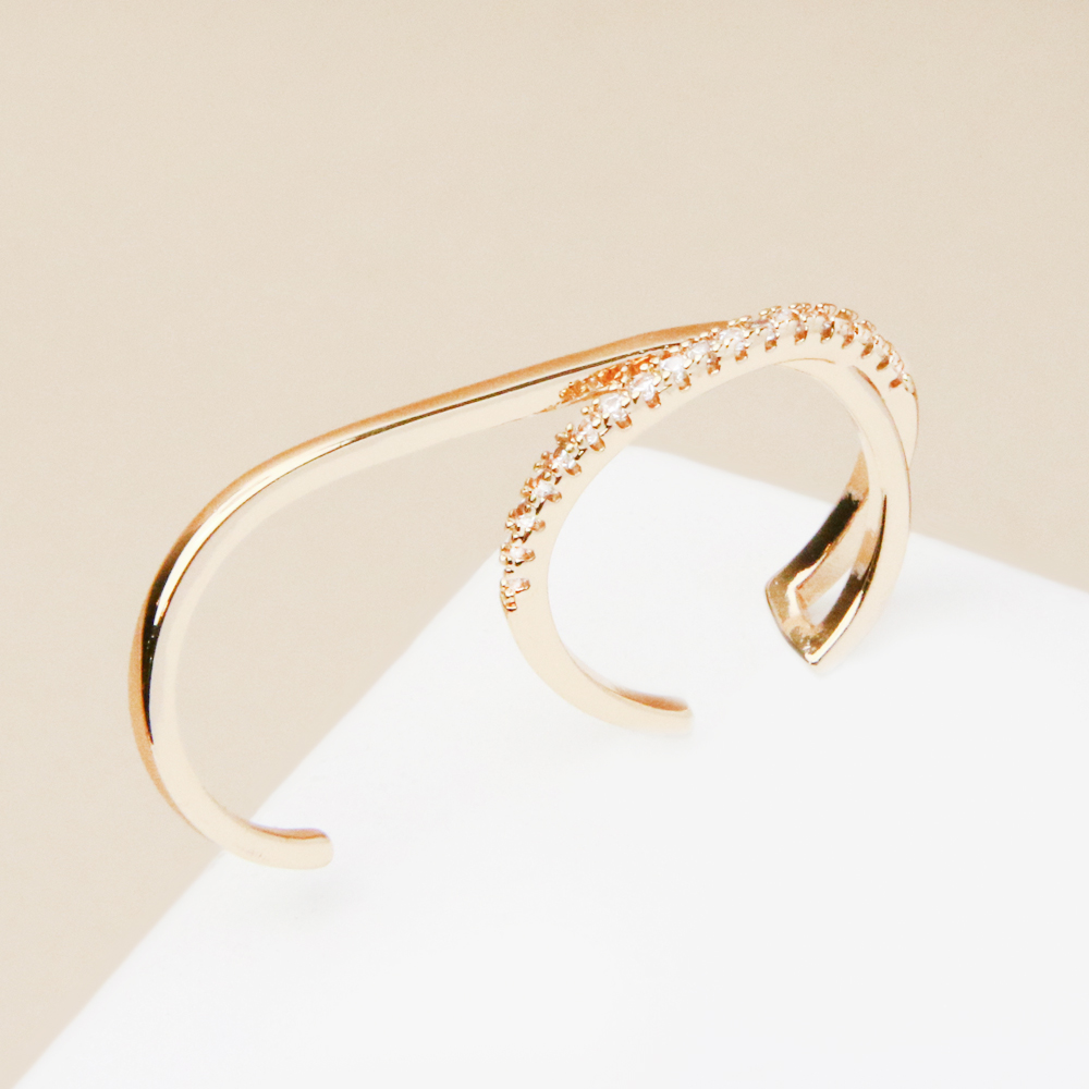 انگشتر دو انگشتی طلایی نگیندار با طراحی خاص و درخشان، انتخابی جذاب برای استایلهای شیک و ترندی است. ترکیب فرم دو انگشتی با نگینهای ظریف و براق، جلوهای لوکس و چشمنواز ایجاد کرده که زیبایی دستان شما را بهخوبی برجسته میکند.