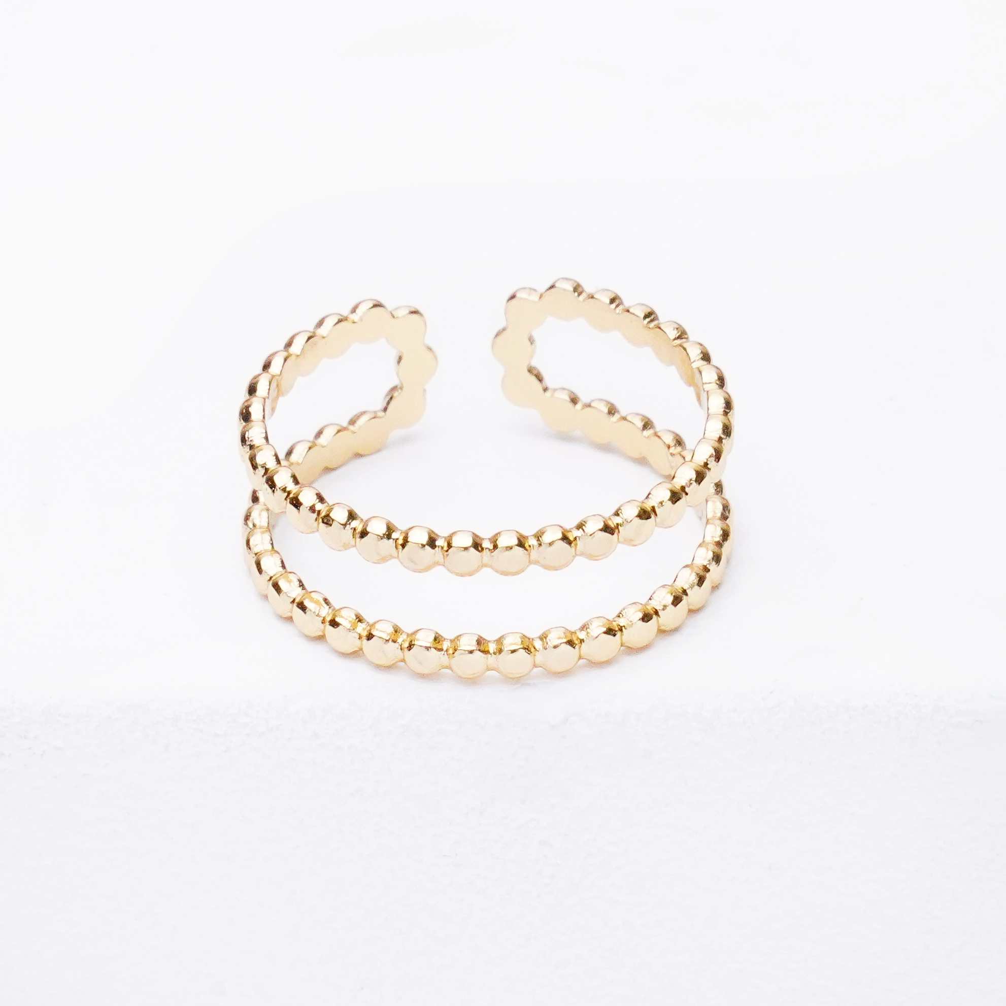 انگشتر دو رینگ ساچمه‌ای با طراحی خاص و جزئیات برجسته، جلوه‌ای متفاوت و مدرن به استایل شما می‌بخشد. ساچمه‌های ظریف کارشده روی رینگ‌ها، بافت و عمق زیبایی ایجاد کرده و ظاهر انگشتر را از سادگی خارج می‌کنند.