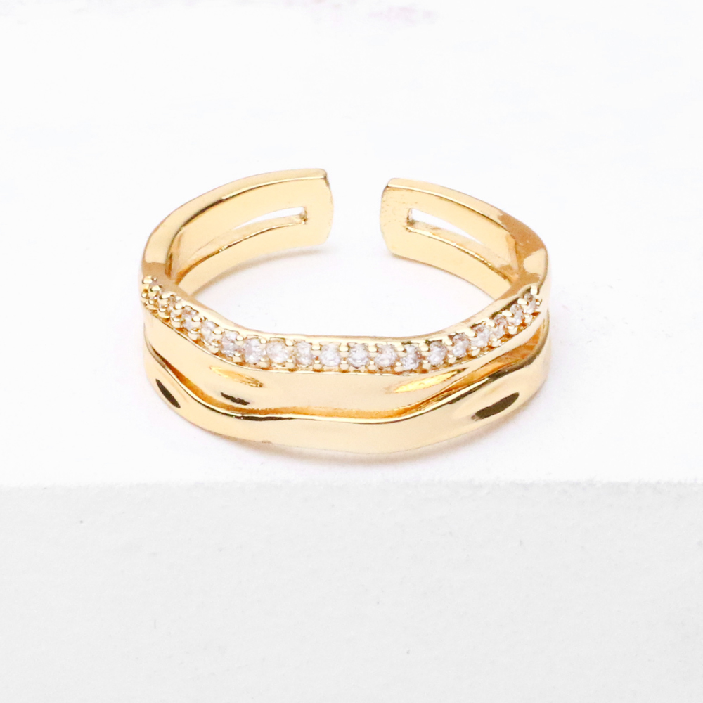 انگشتر رینگ موجی طلایی نگیندار با طراحی الهامگرفته از فرم نرم موج، جلوهای ظریف و درخشان به استایل شما میبخشد. انحنای موجدار رینگ در کنار نگینهای ظریف، ترکیبی چشمنواز ایجاد کرده و ظاهر انگشتر را شیک و متفاوت میکند.