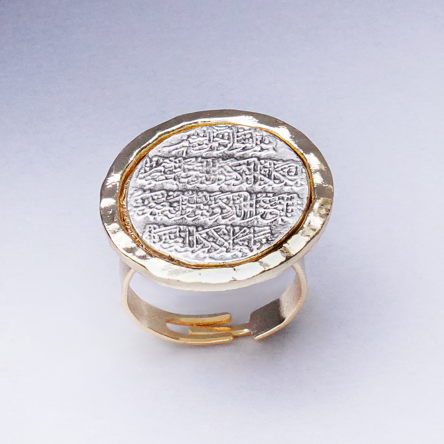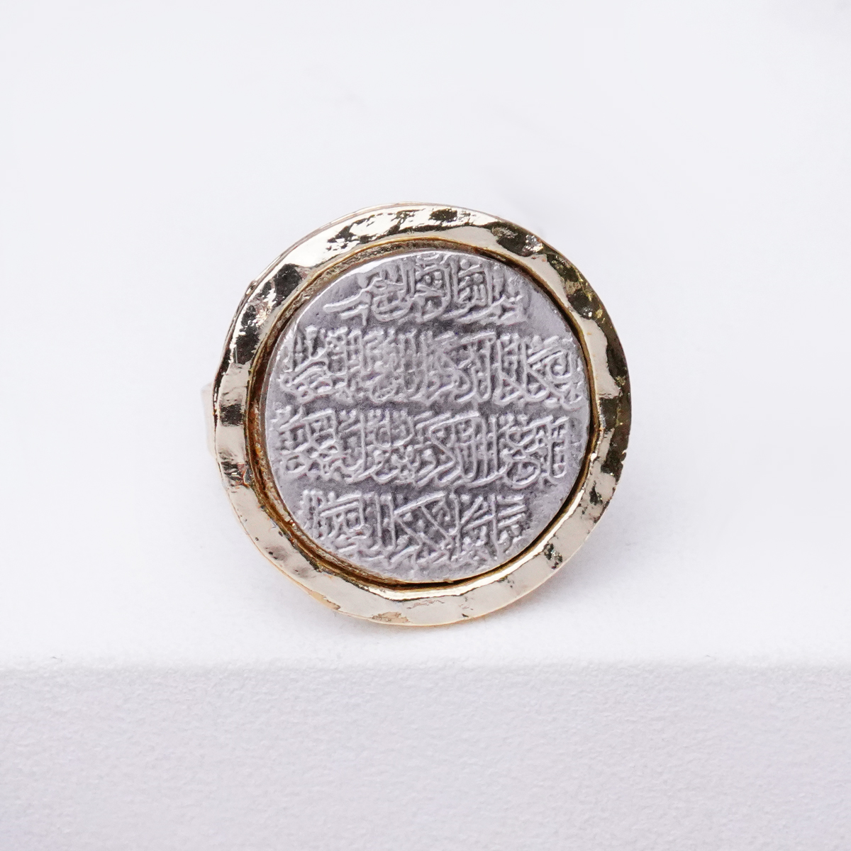 انگشتر سکه دور طلایی آیه با طراحی الهامگرفته از سکه و قاب طلایی، جلوهای معنوی و چشمنواز به استایل شما میبخشد. ترکیب نوشته آیه با حاشیه طلایی، ظاهر انگشتر را خاصتر کرده و حس ارزشمندی و ظرافت را همزمان منتقل میکند.