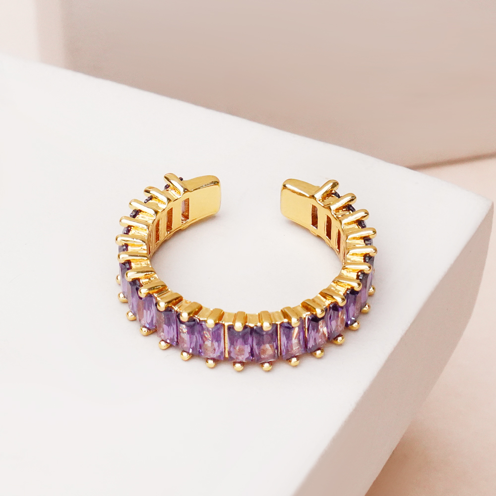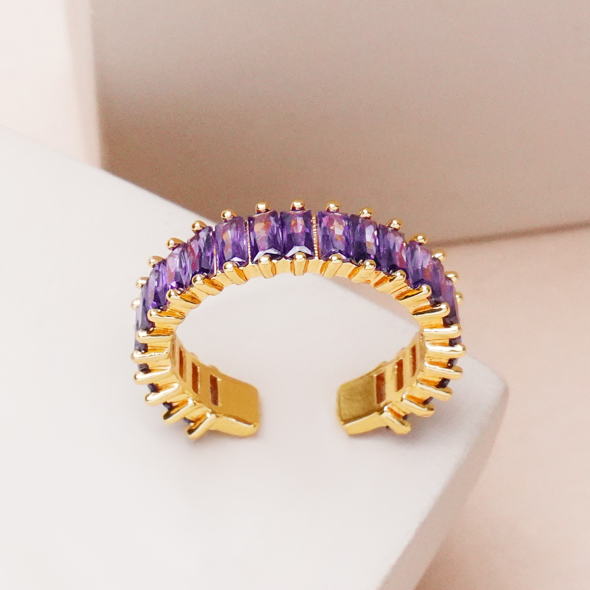 انگشتر طلایی بنفش تنیسی با ردیفی از نگینهای باگت بنفش، بازتابی از استایل اشرافی و مدرن است که با تضاد رنگی جذاب خود، جلوهای خیرهکننده به دستان شما میبخشد.
