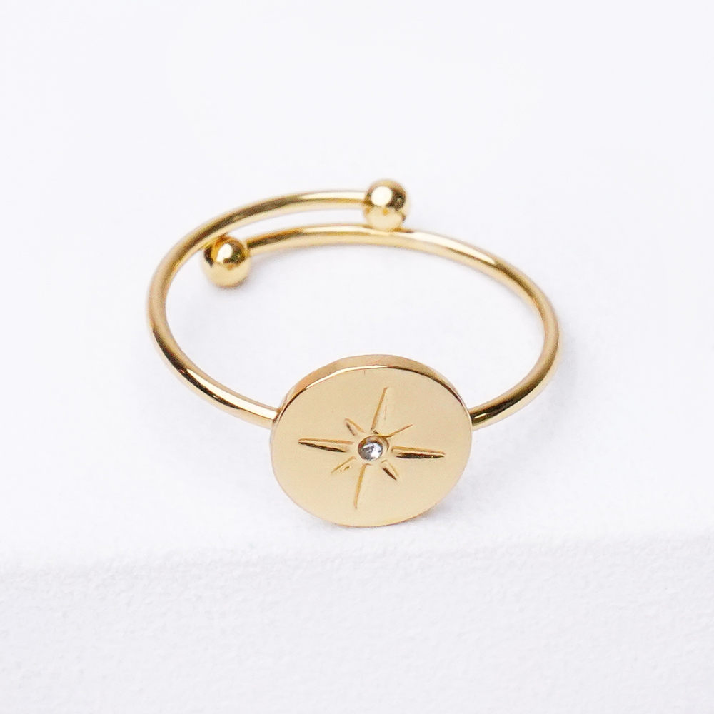 انگشتر طلایی دایره خورشیدی با طراحی مدرن و الهامگرفته از شکل خورشید، جلوهای شیک و درخشان به استایل شما میبخشد. فرم دایرهای و پرتوهای ظریف آن، نور را به زیبایی منعکس کرده و انگشتر را از طرحهای ساده متمایز میکند.
