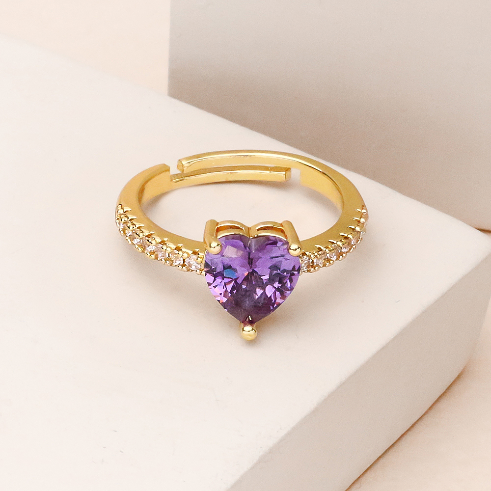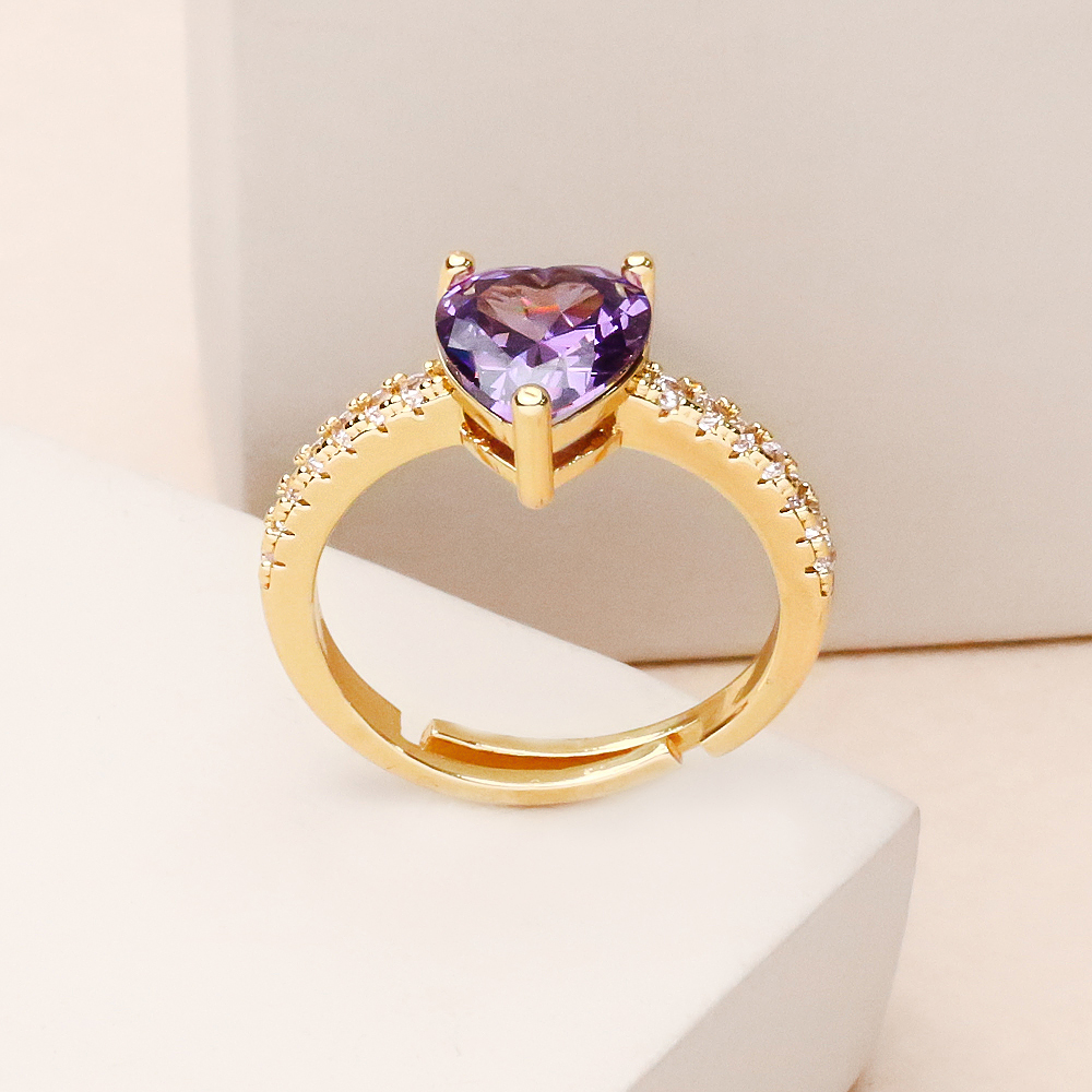 انگشتر قلب بنفش دور نگین طلایی ترکیبی خیره‌کننده از اصالت و ظرافت است که با محوریت یک نگین درشت به شکل قلب و به رنگ بنفش آمتیست طراحی شده است. تلالو نگین مرکزی در کنار درخشش نگین‌های ظریف کار شده روی بدنه (رینگ) طلایی، جلوه‌ای اشرافی و در عین حال مدرن به این اثر بخشیده است.