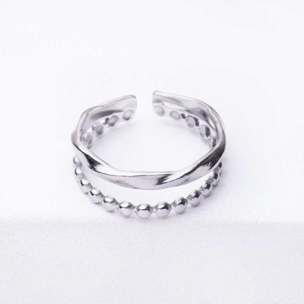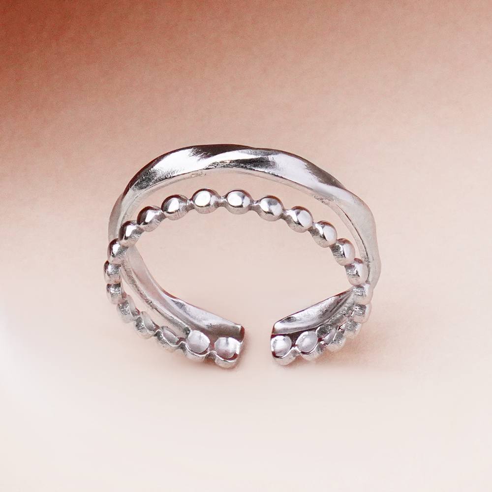 یه انگشتر مینیمال و در عین حال جذاب که از دو رینگ ظریف با جزئیات ساچمهای تشکیل شده. این طراحی باعث میشه روی دست جلوهای لایهلایه و پویا داشته باشه، بدون اینکه شلوغ یا سنگین به نظر برسه. ریزهکاری ساچمهای روی رینگها حس بافت و عمق ایجاد میکنه و رنگ نقرهای براقش هماهنگی آسان با هر استایلی رو تضمین میکنه. این انگشتر از خانه اکسسوری کیان، انتخابی عالی برای کسانی است که دنبال اکسسوری مینیمال، شیک و با جزئیات ظریف هستن.