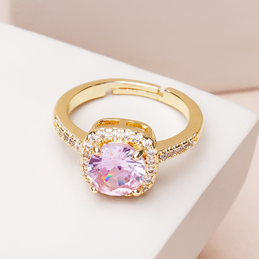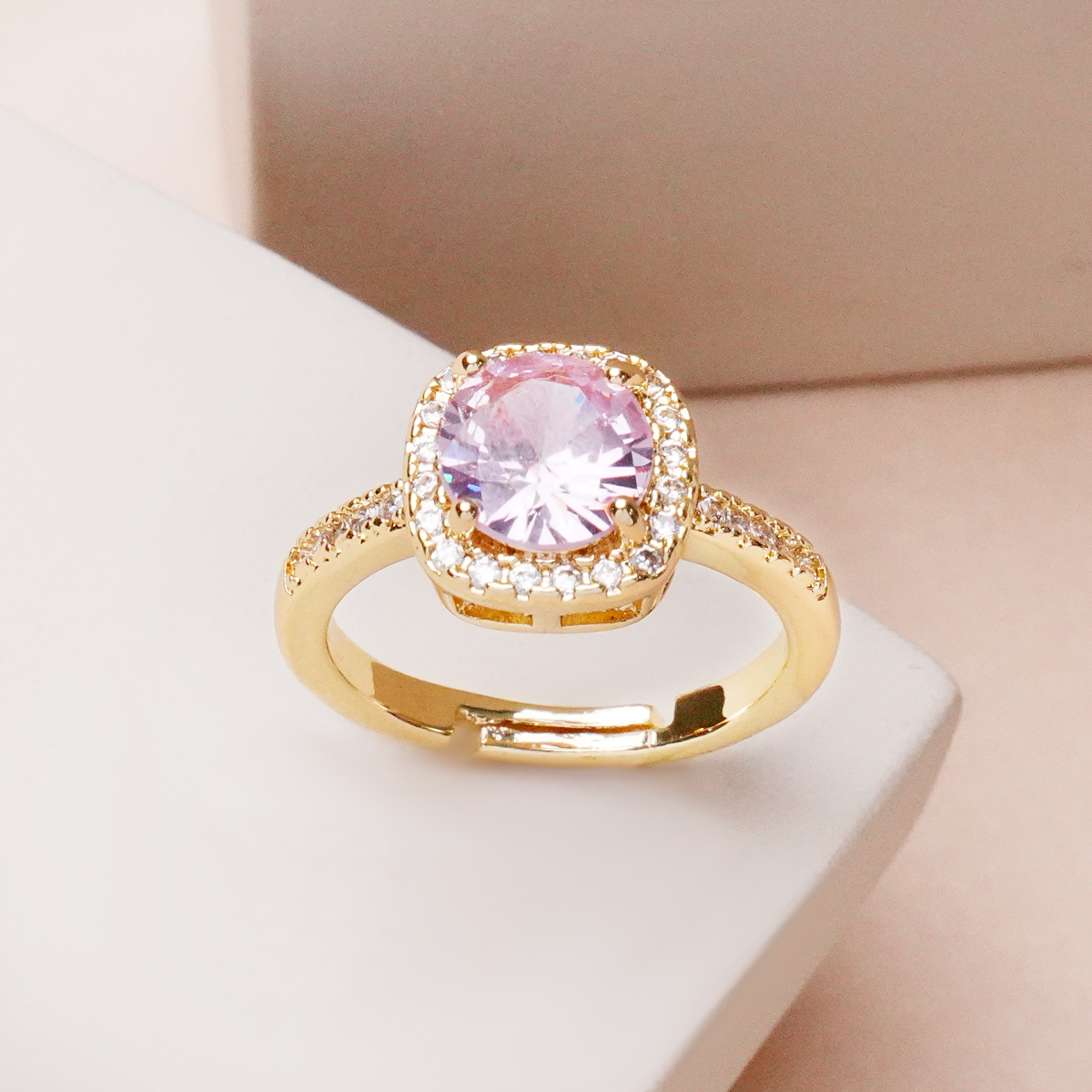 انگشتر نگین صورتی قاب مربعی طلایی با نگین مرکزی صورتی و تراش کوشن (بالشتکی)، تجسمی از شکوه کلاسیک و ظرافت مدرن است که با هاله‌ای از درخشش، جلوه‌ای خیره‌کننده به دستان شما می‌بخشد.