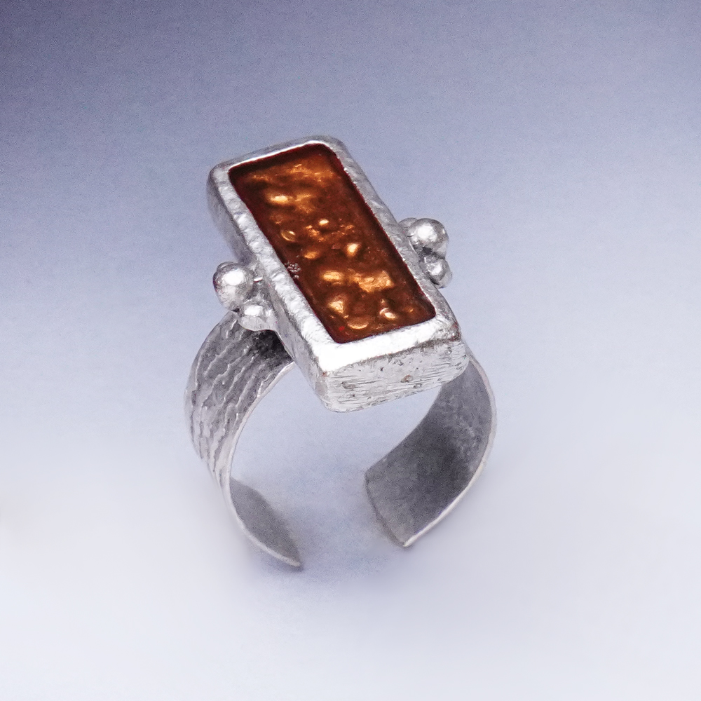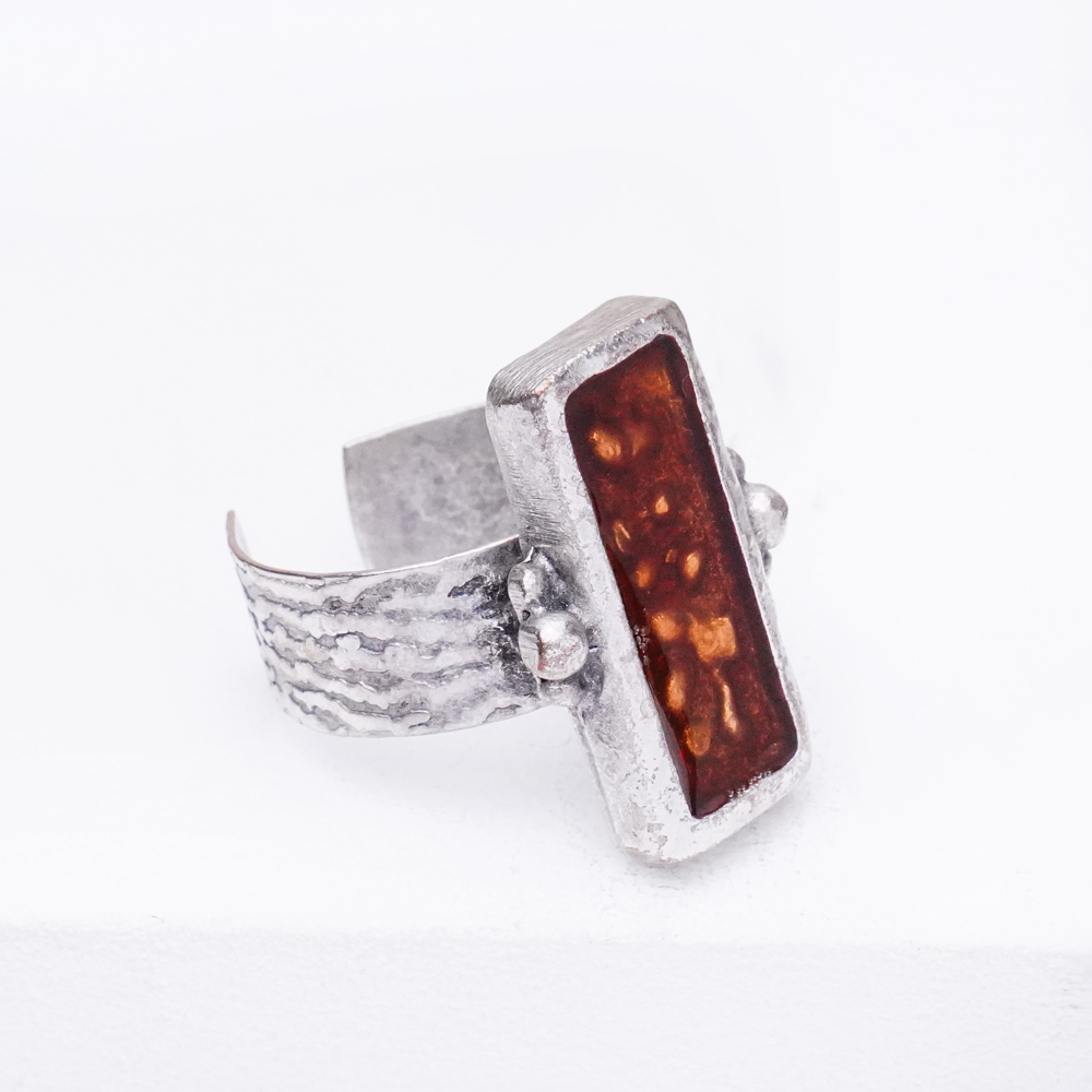 انگشتر ورشو مستطیل مسی با طراحی خاص و فرم مستطیلی، جلوهای متفاوت و کلاسیک به استایل شما میبخشد. رنگ مسی در کنار بدنه ورشو، حس گرما و اصالت ایجاد کرده و ظاهر انگشتر را چشمنواز و متمایز نشان میدهد.