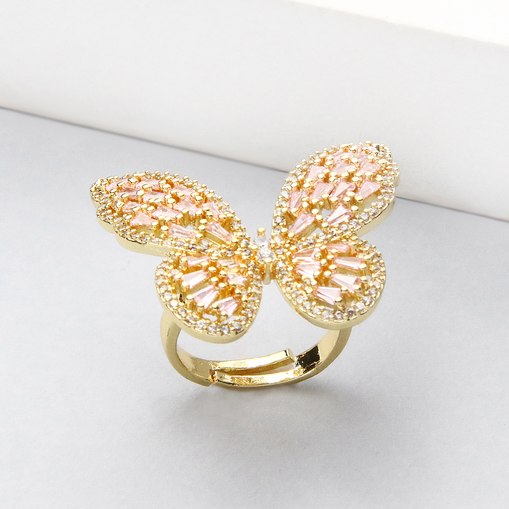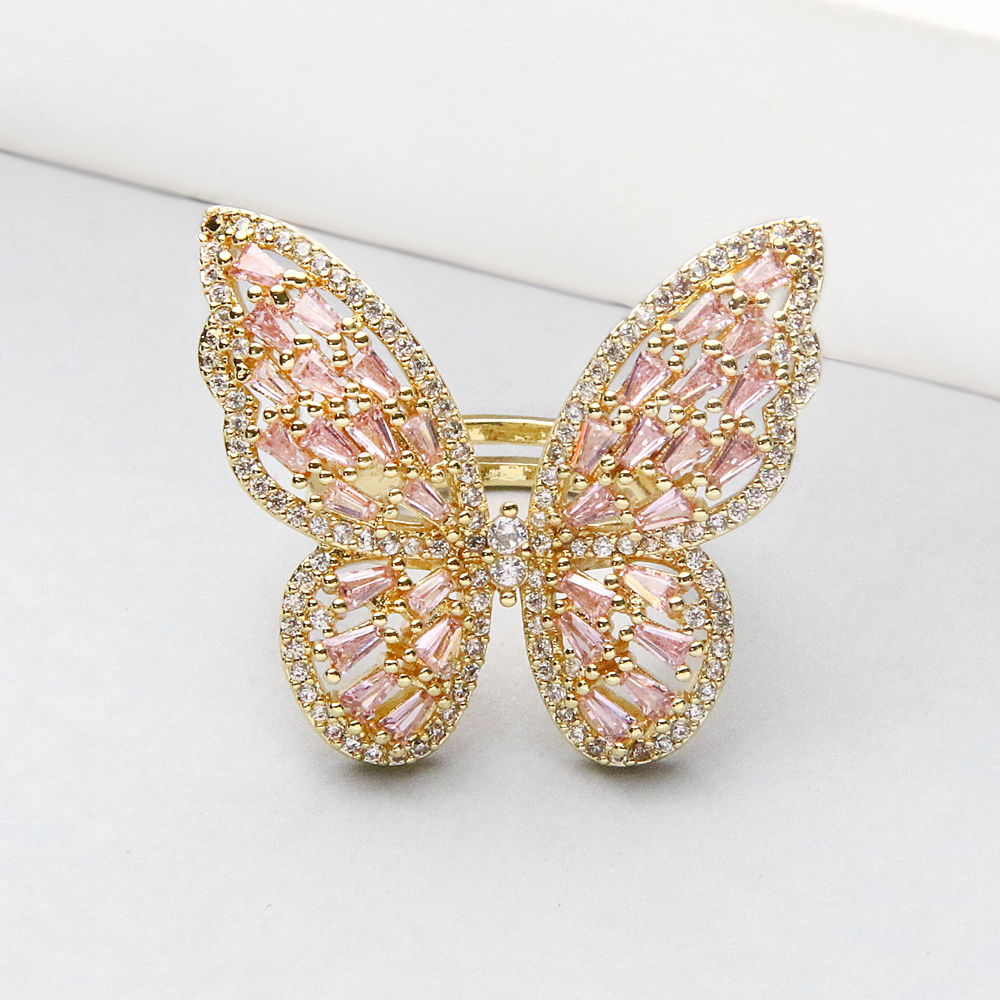 انگشتر پروانه طلایی نگیندار صورتی ترکیبی دلنشین از لطافت، ظرافت و جلوهای فانتزی است. طراحی پروانه با نگینهای صورتی درخشان، حس لطیف و دخترانهای به استایل شما میبخشد و انتخابی جذاب برای افرادیست که به اکسسوریهای خاص و احساسی علاقه دارند.