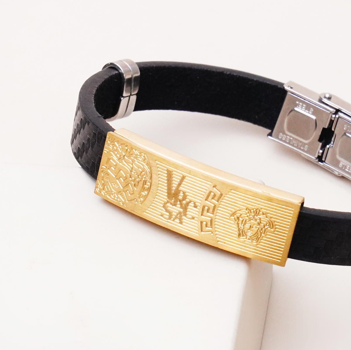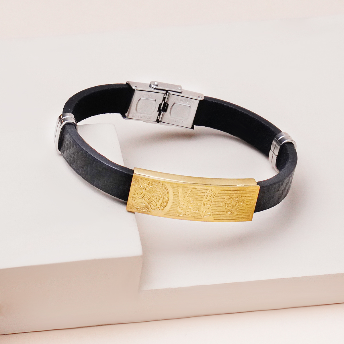 دستبند پلاک دار بند چرمی ترکیبی جذاب از استایل مدرن و کلاسیک است. تضاد رنگ طلایی براق پلاک با بند چرمی مشکی، جلوهای خاص و چشمگیر ایجاد میکند که بهراحتی با استایلهای اسپرت و نیمهرسمی هماهنگ میشود.