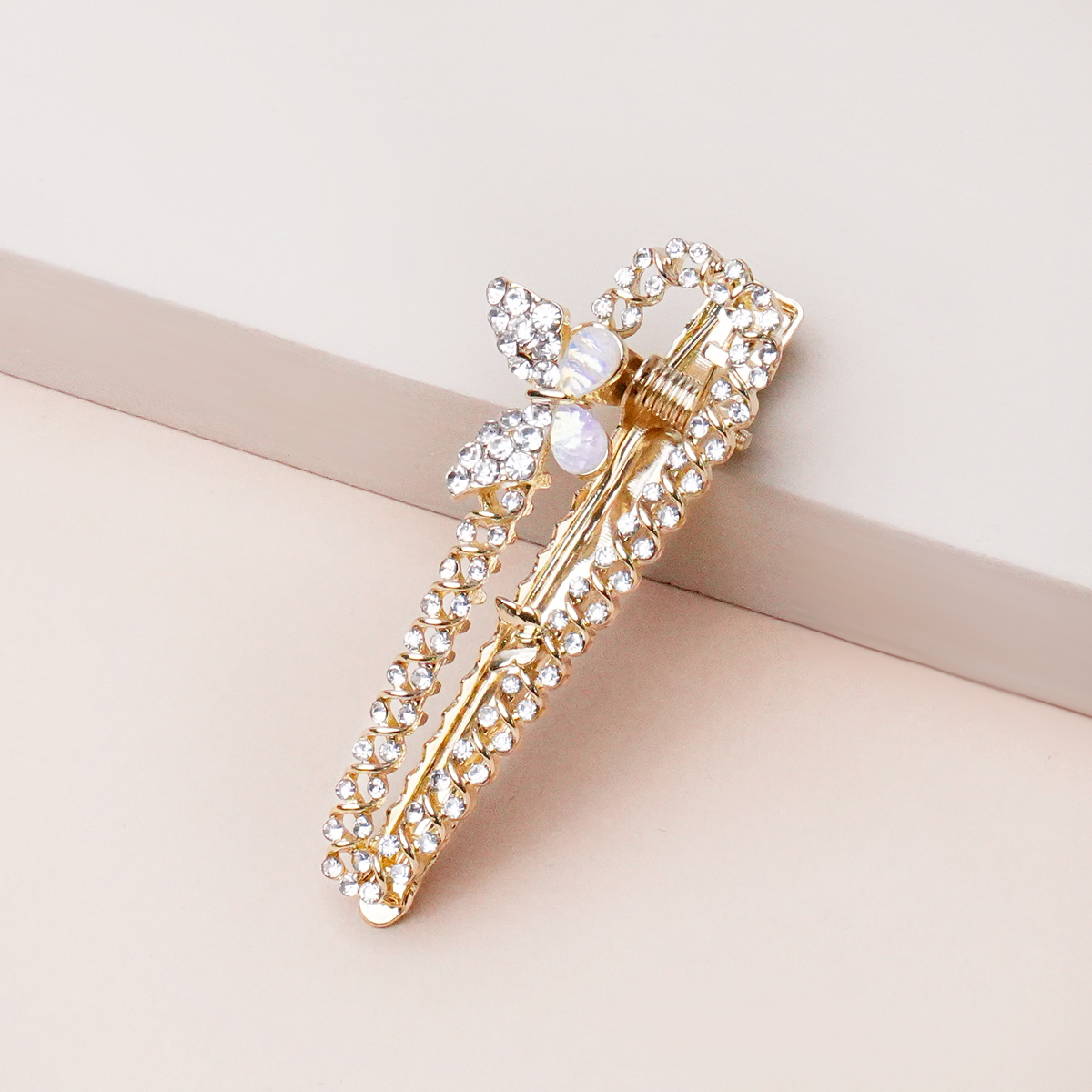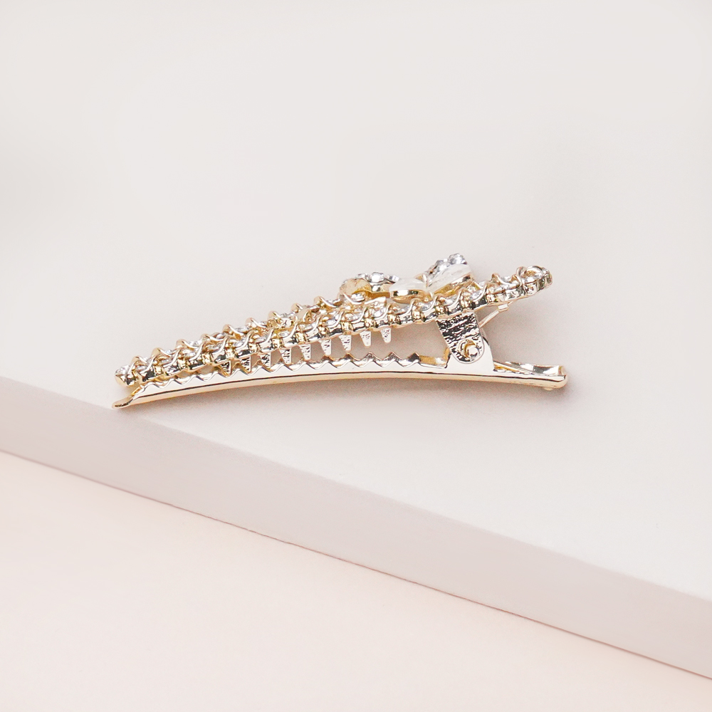 گیره طلایی تمام نگین با طراحی ظریف و الهام‌گرفته از فرم لطیف پروانه با نگین های درخشان، انتخابی شیک و چشم‌نواز برای تکمیل استایل‌های دخترانه و مجلسی است. رنگ طلایی براق در کنار جزئیات ظریف این مدل، جلوه‌ای درخشان و خاص به موها می‌بخشد و به‌راحتی با استایل‌های مینیمال و رسمی هماهنگ می‌شود. گیره محکم و استاندارد آن موها را بدون آسیب ثابت نگه می‌دارد و استفاده‌ای راحت در طول روز فراهم می‌کند. این مدل زیبا در خانه اکسسوری کیان با دقت در کیفیت و طراحی عرضه شده تا ترکیبی از ظرافت، درخشش و دوام را تجربه کنید.
