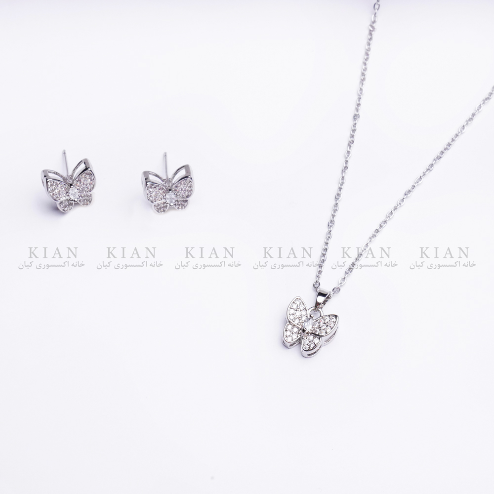 ست پروانه نقره ای با طراحی ظریف پروانه و نگین های درخشان، انتخابی خاص برای دخترانی که دنبال اکسسوری ساده اما چشم گیر هستن.