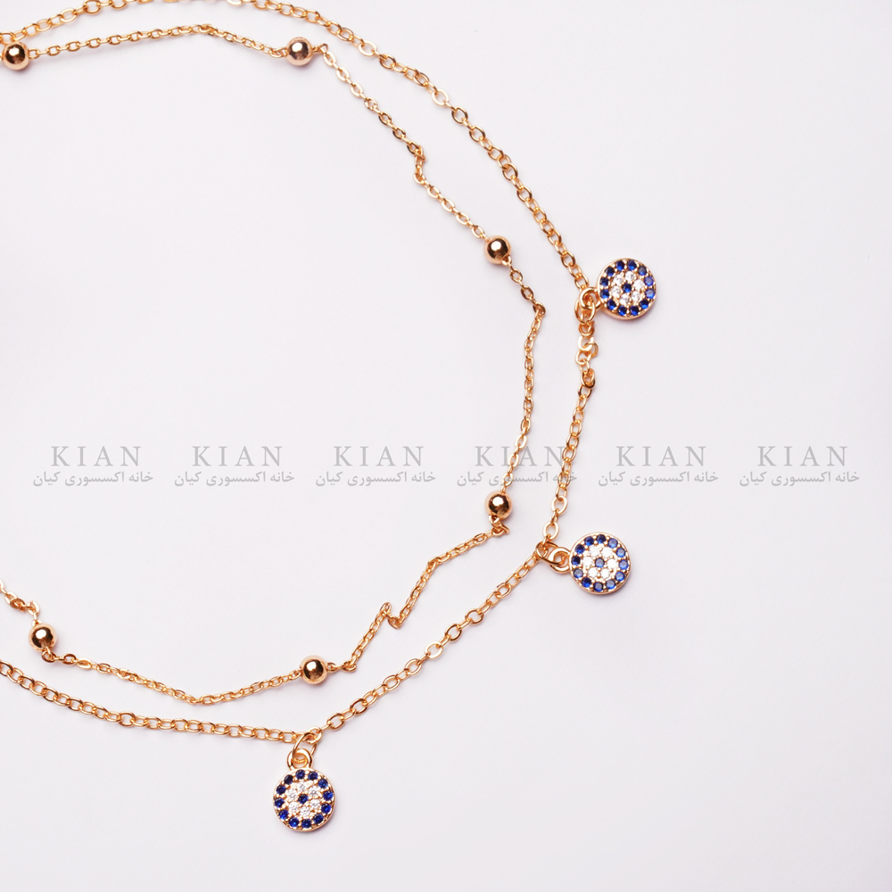 پابند طلایی دو رج چشم نظر با طراحی مدرن و آویزهای نمادین چشم نظر، تلفیقی از زیبایی و معنای فرهنگی را به همراه دارد. زنجیرهای طلایی درخشان در کنار نماد چشم نظر، جلوه ای شیک، متفاوت و محافظ انرژی به این اکسسوری بخشیده اند.