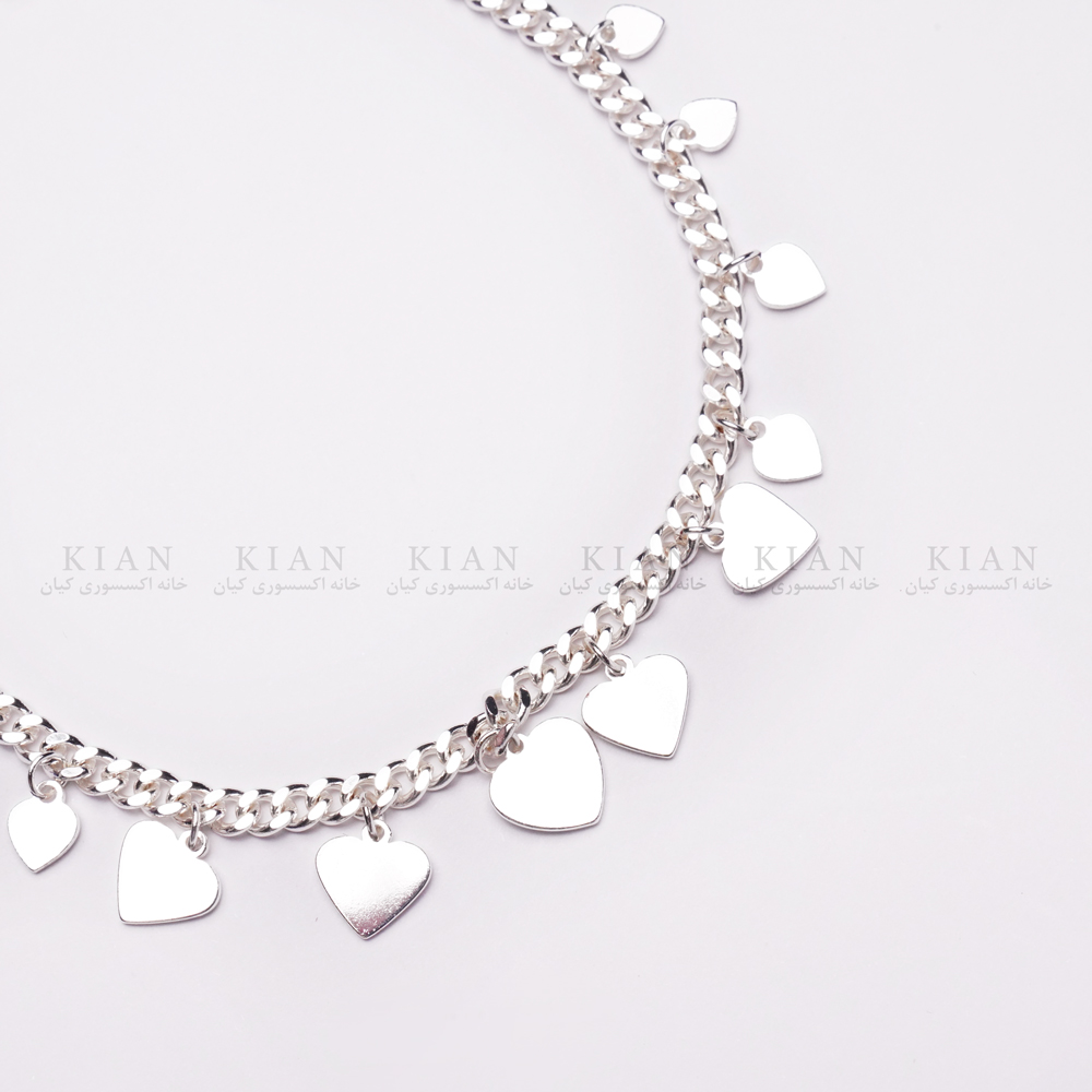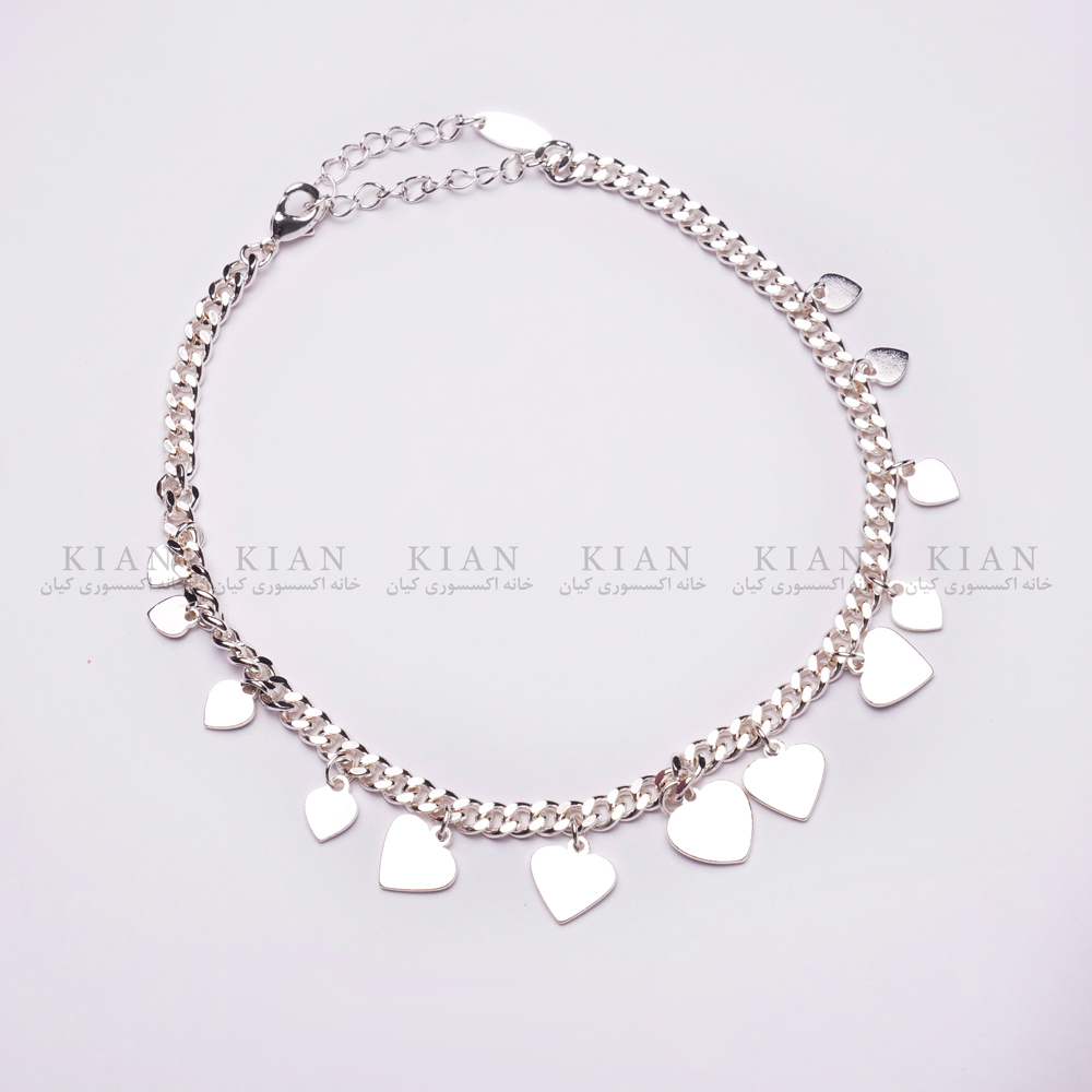 پابند آویز قلبی نقره ای با آویزهای ظریف قلبی، نمایانگر تلاقی زیبایی کلاسیک و جذابیت مدرن است. حرکات آویزهای قلبی هنگام راه رفتن، جلوه ای زنانه و دل نشین به استایل شما می بخشند.