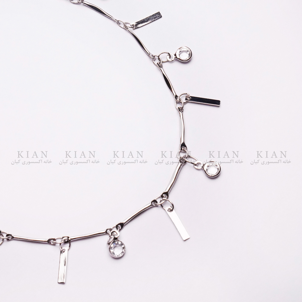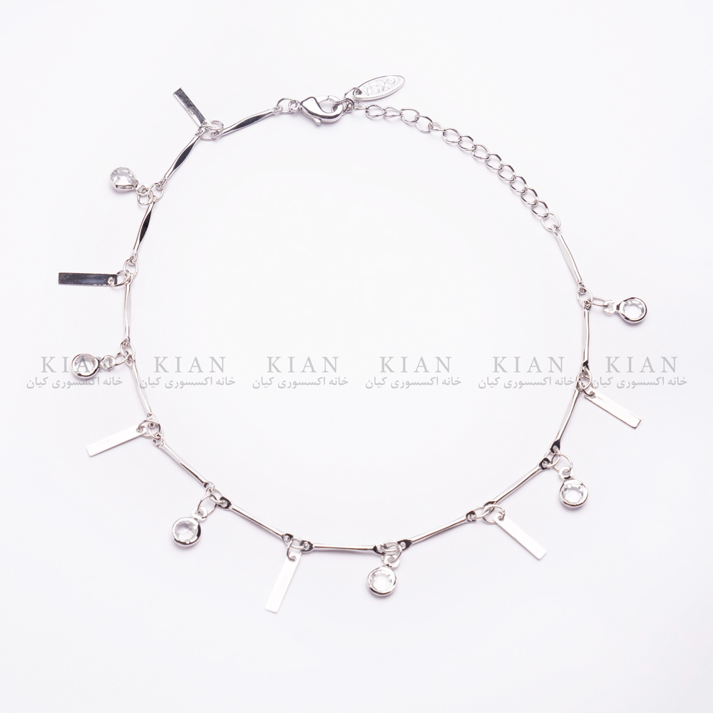 پابند نقره ای با آویزهای مستطیلی براق و نگین های ریز درخشان، ترکیبی از طراحی مدرن و زیبایی کلاسیک را ارائه می دهد. فرم هندسی در کنار ظرافت زنجیر، این اکسسوری را برای استایل های مینیمال و خاص مناسب ساخته است.