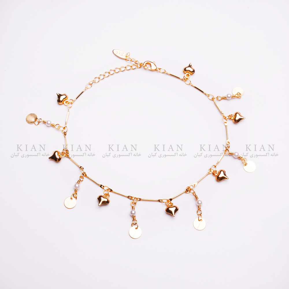 پابند طلایی با آویزهای ظریف سکه و مروارید، نمایانگر تلاقی زیبایی کلاسیک و جذابیت مدرن است. حرکات نرم آویزها هنگام راه رفتن، جلوهای زنانه و دلنشین به استایل شما میبخشند.