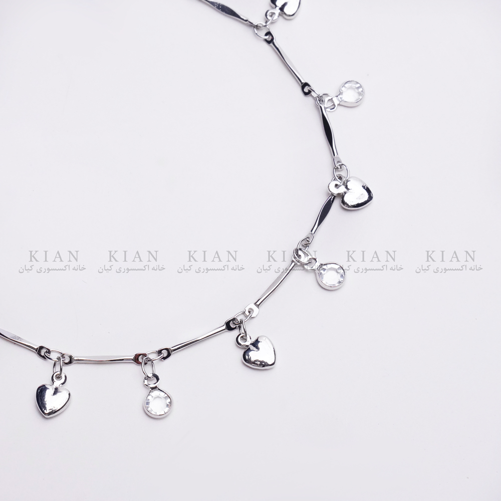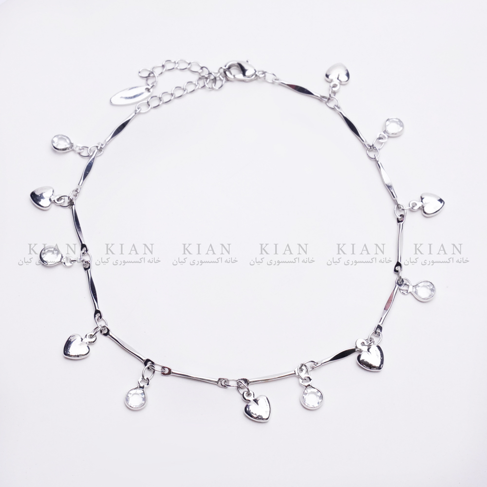 پابند قلب و نگین، با ترکیبی زیبا از آویزهای قلب نقره ای و نگین های درخشان، جلوه ای دخترانه و شیک به استایل تابستانی شما می بخشد.