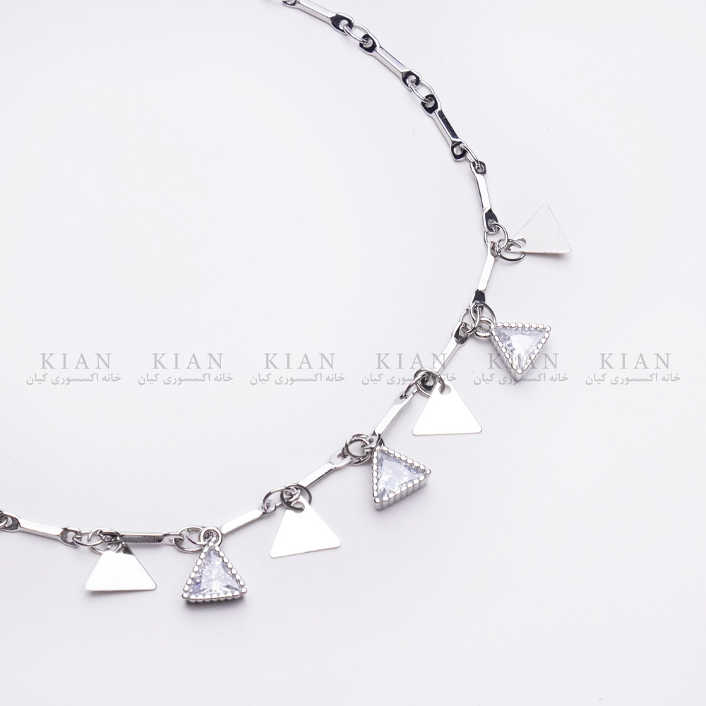 پابند مثلثی نگین دار با طراحی هندسی مدرن و استفاده از نگین های درخشان، ترکیبی زیبا از سادگی و شیک پوشی را به نمایش می گذارد.