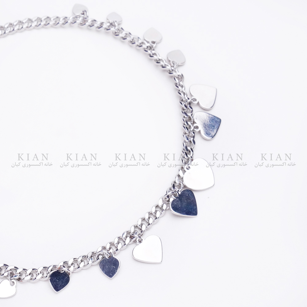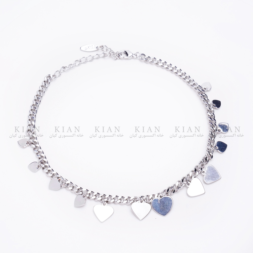 پابند پر آویز قلب نقره ای، با ترکیبی زیبا از آویزهای قلب نقره ای، جلوه ای دخترانه و شیک به استایل تابستانی شما می بخشد.