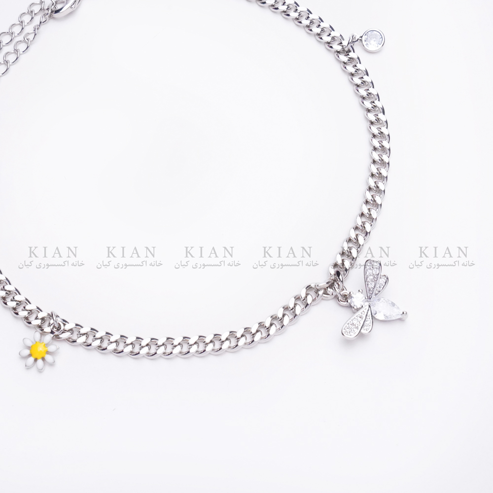 ترکیب زنجیر ظریف با آویز گل و سنجاقک، جلوه ای چشم نواز و متفاوت ایجاد کرده که مناسب استفاده روزمره یا مهمانی های تابستانی است. یک انتخاب دل نشین برای کسانی که به جزئیات ظریف و رنگ های ملایم علاقه دارند.