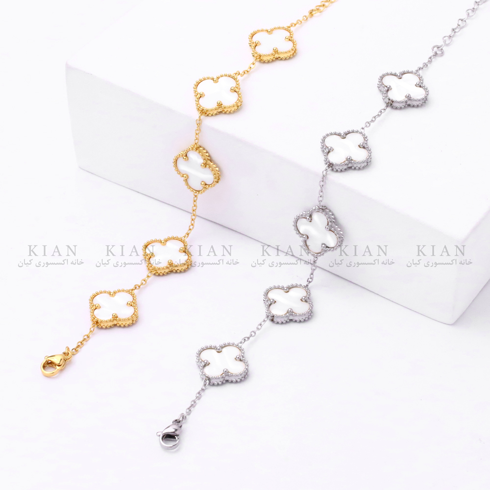 این دستبندها در دو رنگ طلایی و نقرهای عرضه میشوند و هرکدام با چهاربرگهای برجسته و صیقلی طراحی شدهاند که نور را به زیبایی بازتاب میدهند. اندازه بزرگتر چهاربرگها نسبت به مدلهای ریز، ظاهر دستبند را رسمیتر، لاکچریتر و مناسبتر برای مهمانیها و استایلهای شیک میکند.
