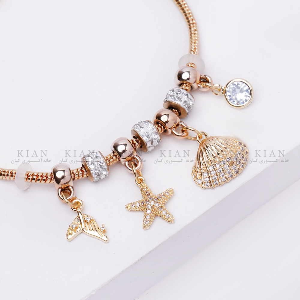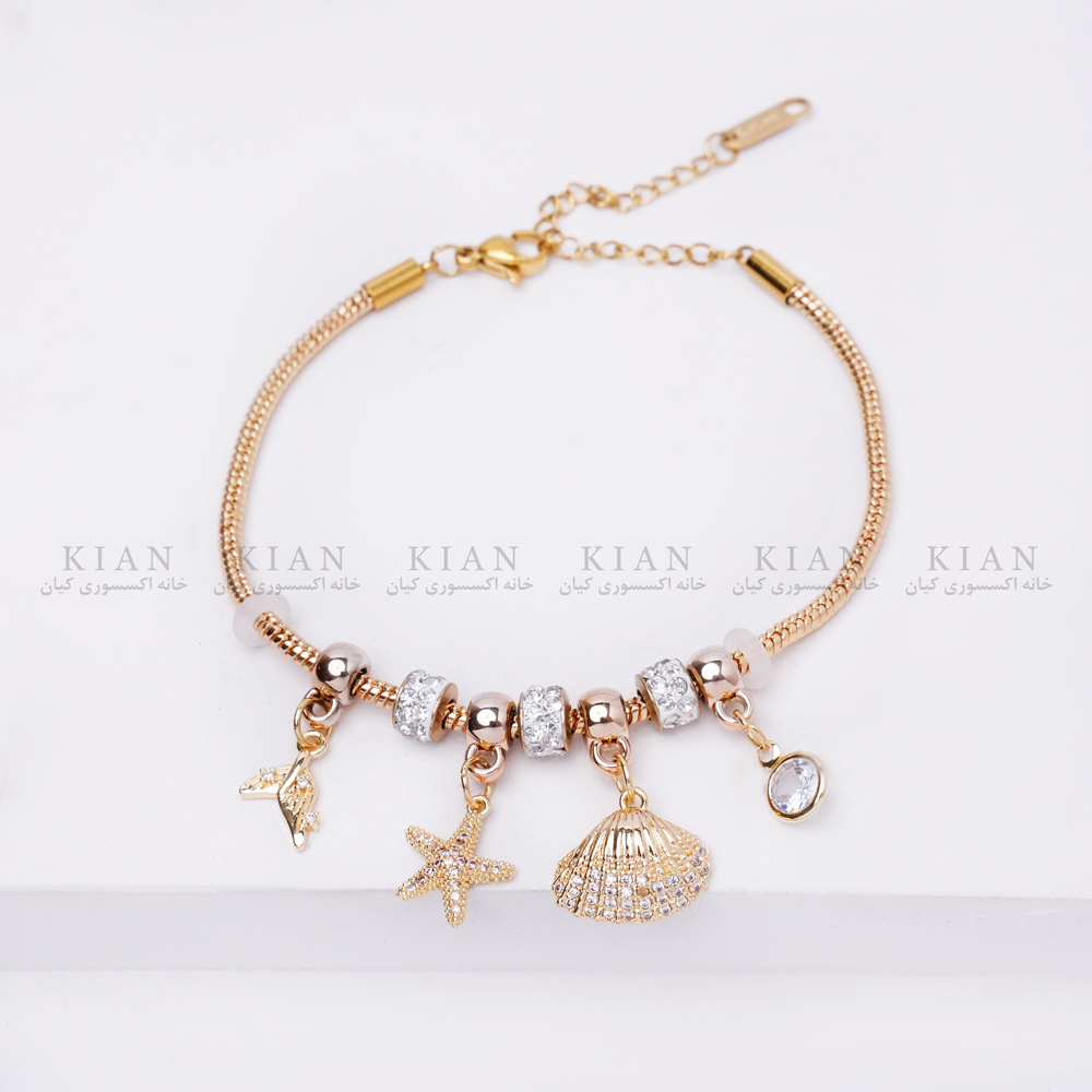 دستبند آویزدار صدف طلایی از برند خانه اکسسوری کیان، تلفیقی زیبا از درخشش طلا و لطافت دریا است. این مدل با آویزهای صدف، ستاره دریایی و مروارید کوچک، حس تابستان، آرامش و انرژی مثبت را به استایل شما میآورد.