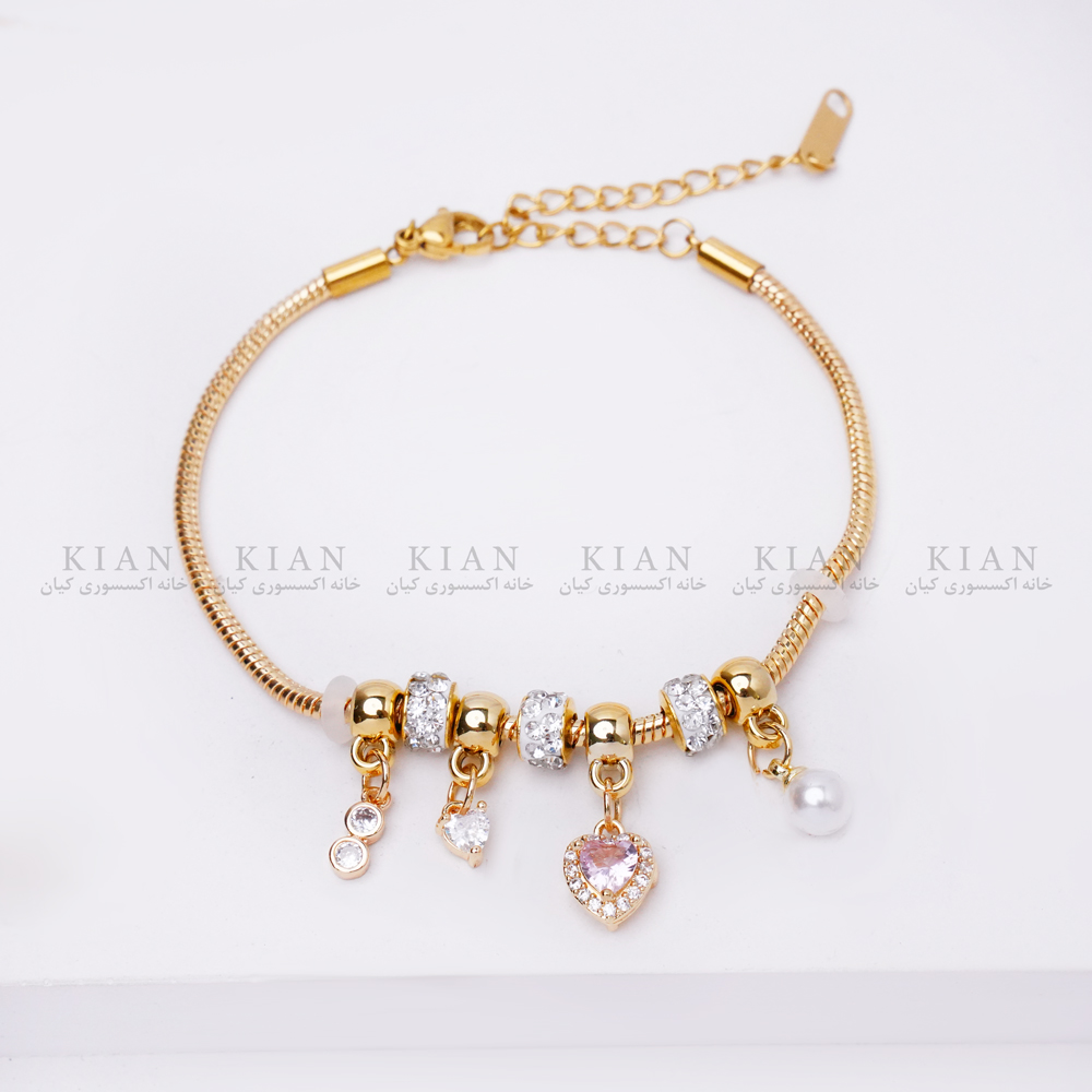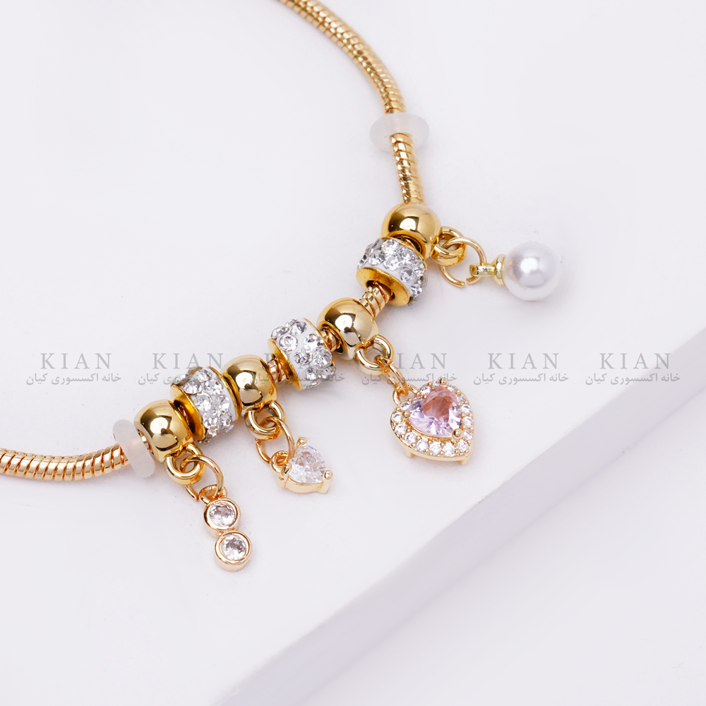دستبند آویزدار قلب صورتی از برند خانه اکسسوری کیان، با طراحی عاشقانه و رنگی لطیف، جلوهای دخترانه و ظریف به استایل شما میبخشد. آویز قلب صورتی در کنار جزئیات طلایی و مهرههای براق، ترکیبی چشمنواز از عشق و درخشش را خلق کرده است.