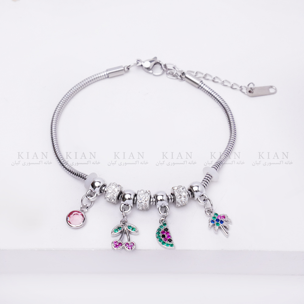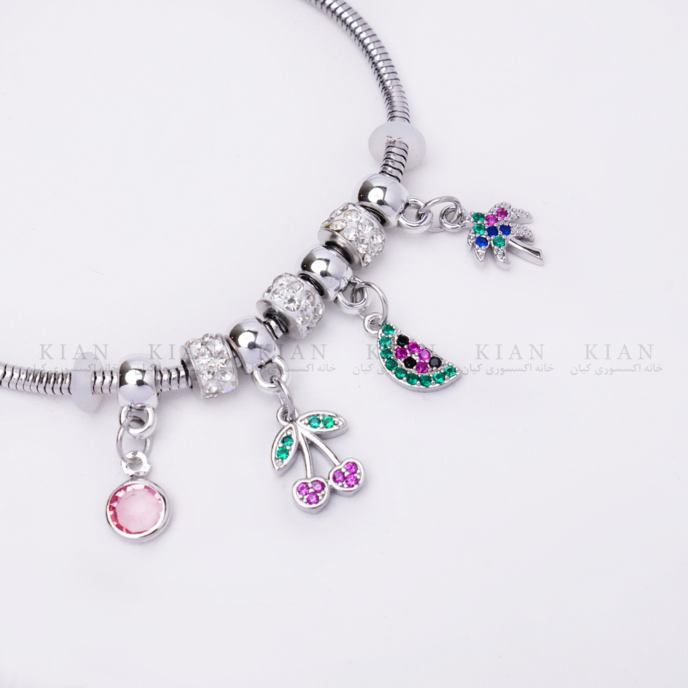 دستبند آویزدار گیلاس نقره ای از برند خانه اکسسوری کیان، مدلی فانتزی، شاد و جذاب است که با طراحی رنگارنگ و آویزهای میوه‌ای خود، حس طراوت و انرژی مثبت را به استایل شما می‌بخشد. آویز گیلاس قرمز در کنار آویزهای براق دیگر، جلوه‌ای بازیگوش و در عین حال شیک ایجاد کرده که مخصوص استایل‌های دخترانه و تابستانی است.