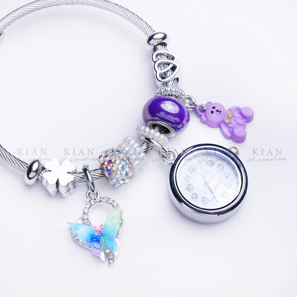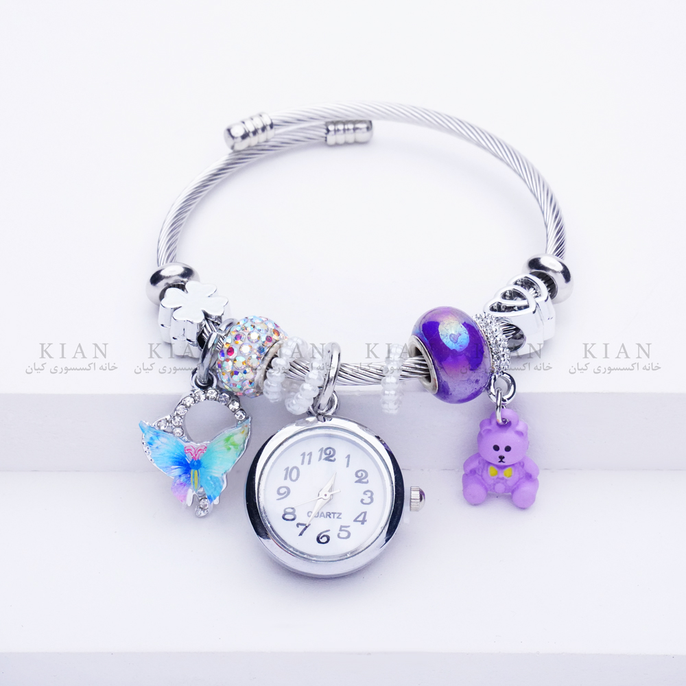 دستبند بنگل ساعت دار تدی بنفش با طراحی فانتزی و بامزه، انتخابی خاص و دوست داشتنی برای استایل های دخترانه است. صفحه ساعت با طرح خرس تدی و رنگ بنفش جذاب، جلوه ای شیرین و متفاوت ایجاد کرده و ترکیب آن با بند بنگل فلزی استایلی شیک و مدرن می سازد. این دستبند زیبا و پرطرفدار را می توانید از خانه اکسسوری کیان با کیفیت بالا و قیمت مناسب تهیه کنید.