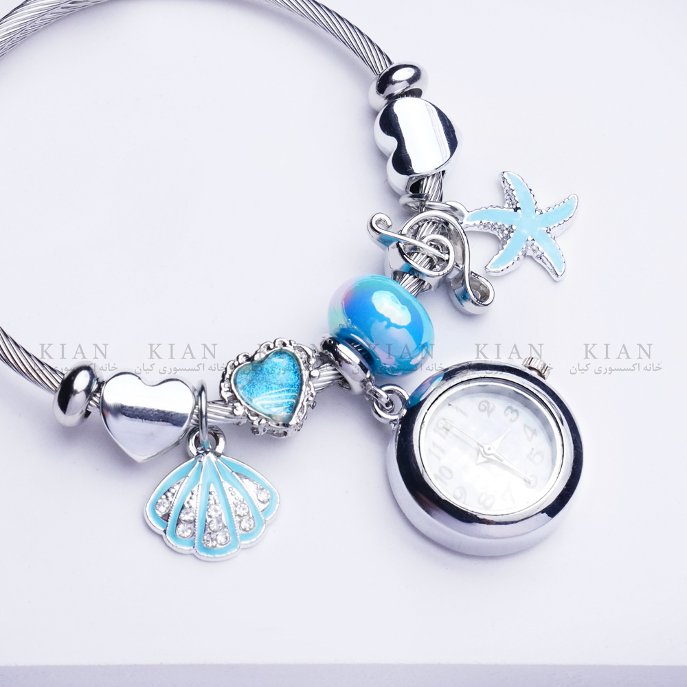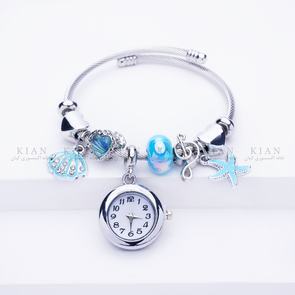 دستبند بنگل ساعتدار صدف آبی با طراحی صدف و ترکیب بند بنگل فلزی و صفحه ساعت شیک، انتخابی مدرن و متفاوت برای استایل های دخترانه است. رنگ آبی جذاب صفحه جلوه ای خاص و فانتزی ایجاد کرده و این دستبند را به گزینه ای عالی برای استفاده روزمره یا هدیه ای خاص تبدیل می کند. این مدل زیبا و پرطرفدار را می توانید از خانه اکسسوری کیان با کیفیت بالا و قیمت مناسب تهیه کنید.