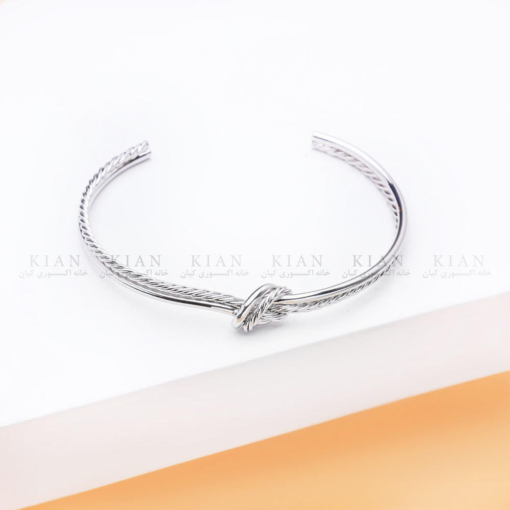 این دستبند با طراحی نیم‌دایره‌ای باز ساخته شده و بدنه آن از دو رج فلزی موازی تشکیل شده که جلوه‌ای مرتب، مدرن و استایل‌ساز ایجاد می‌کند. در مرکز دستبند، یک گره کوچک و ظریف قرار گرفته که نقطه‌ی تمرکز بصری و زیبایی اصلی این مدل است. آبکاری سیلور براق نیز ظاهری تمیز، شیک و مناسب برای استفاده روزمره و رسمی ایجاد کرده است.