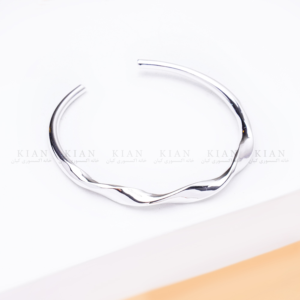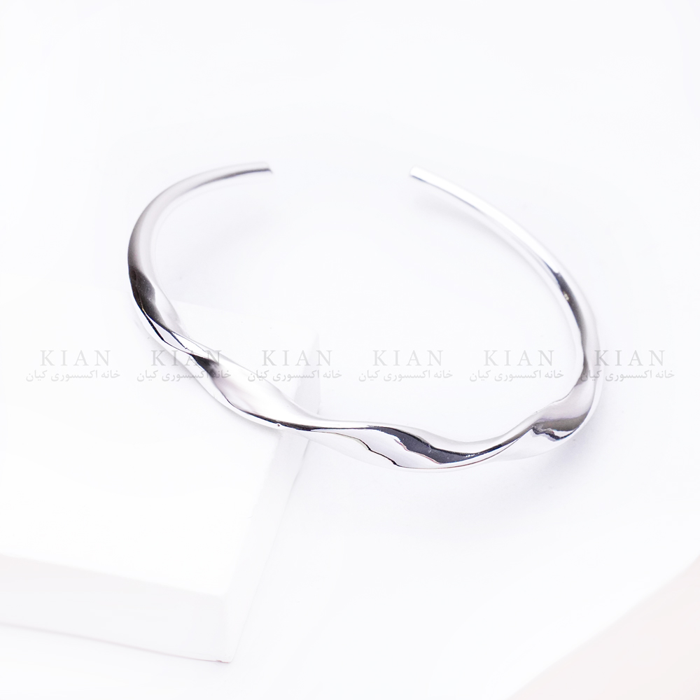 این دستبند با فرم نیم‌دایره‌ای باز ساخته شده و در بخش جلویی دارای یک پیچ نرم و هنری است؛ جزئیاتی کوچک اما بسیار خاص که ظاهر دستبند را متفاوت و مدرن می‌کند. آبکاری سیلور براق، جلوه‌ای خنک، تمیز و بسیار شیک به آن بخشیده و آن را مناسب انواع استایل‌ها کرده است.