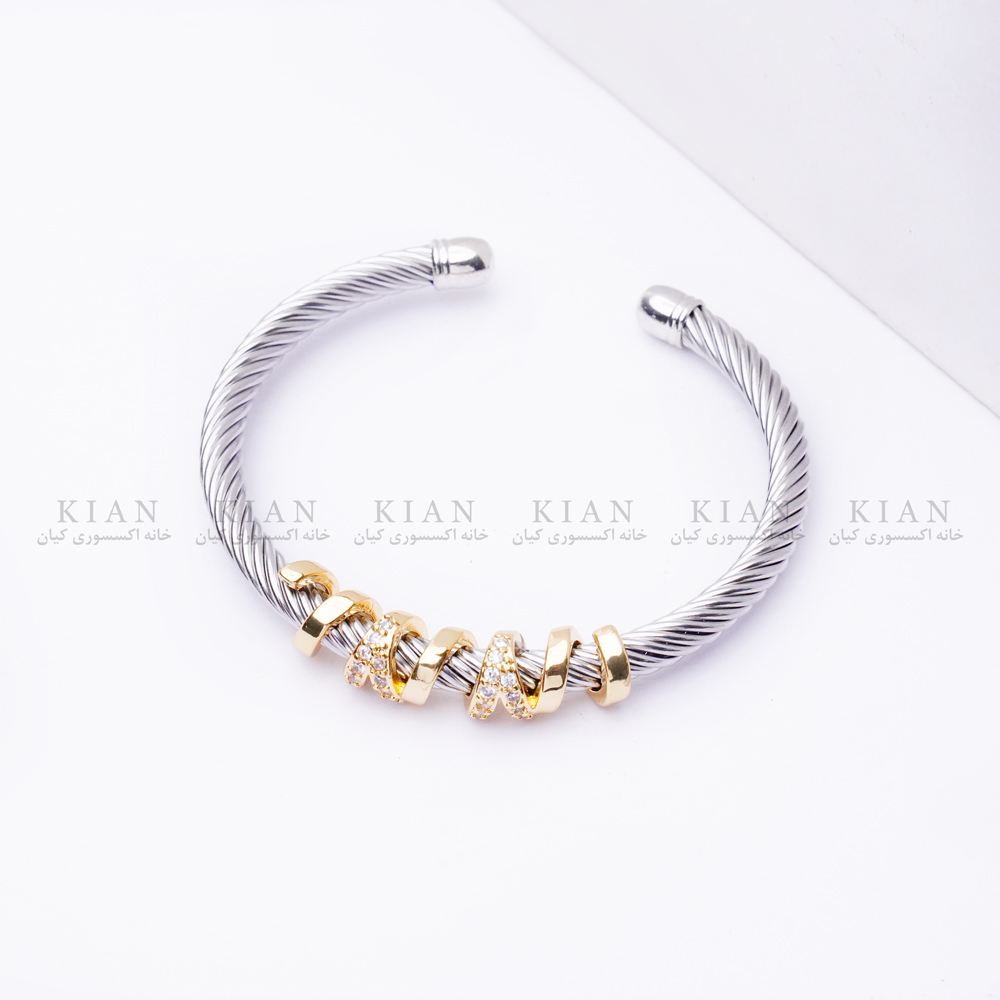 دستبند بنگل نگین‌دار مدلی ظریف و زیباست که با ردیفی از نگین‌های طلایی کوچک روی بدنه‌ی نقره‌ای بافت‌دار، جلوه‌ای براق و چشم‌گیر ایجاد می‌کند. این تضاد رنگی جذاب باعث شده دستبند برای انواع استایل‌ها، از روزمره تا مجلسی، مناسب باشد.