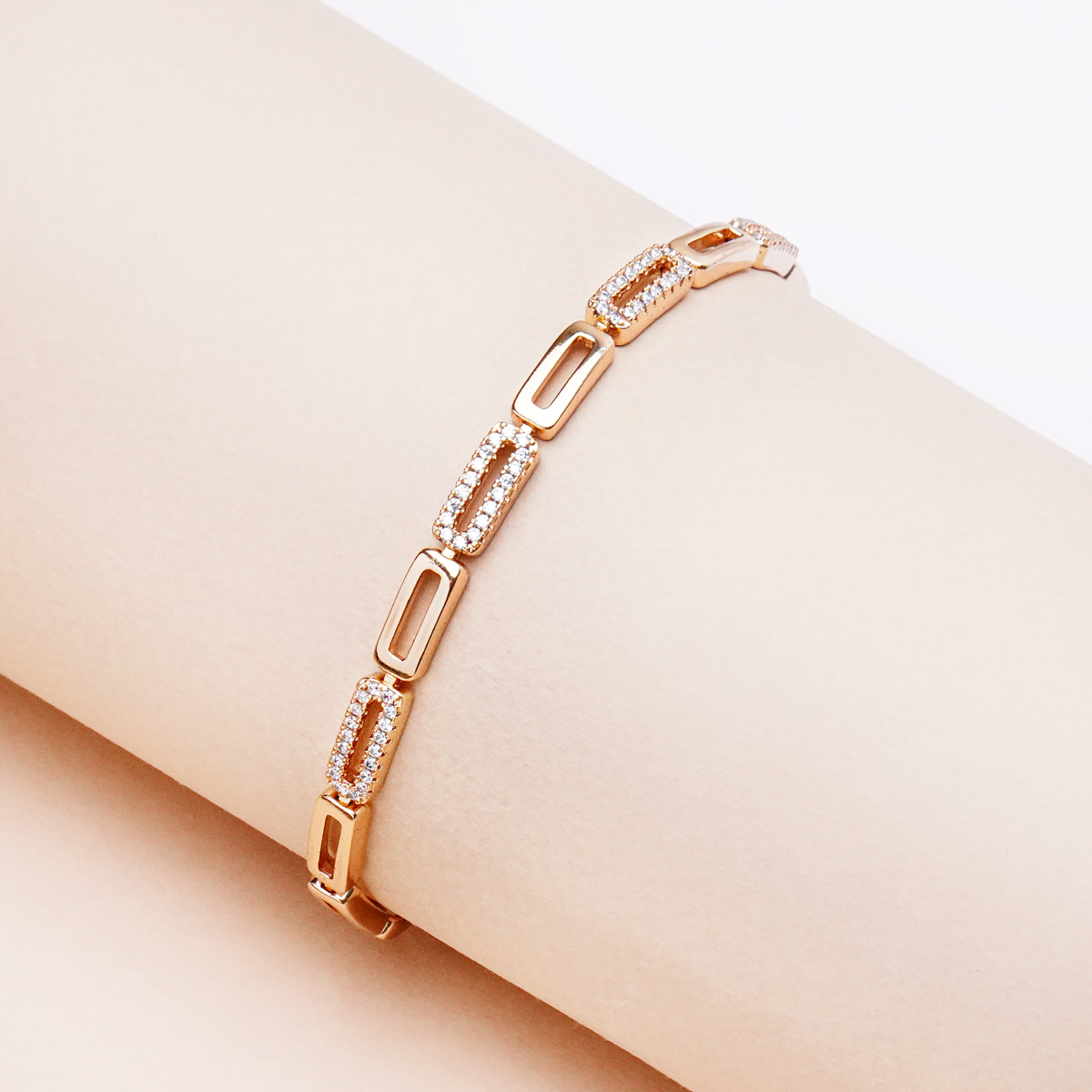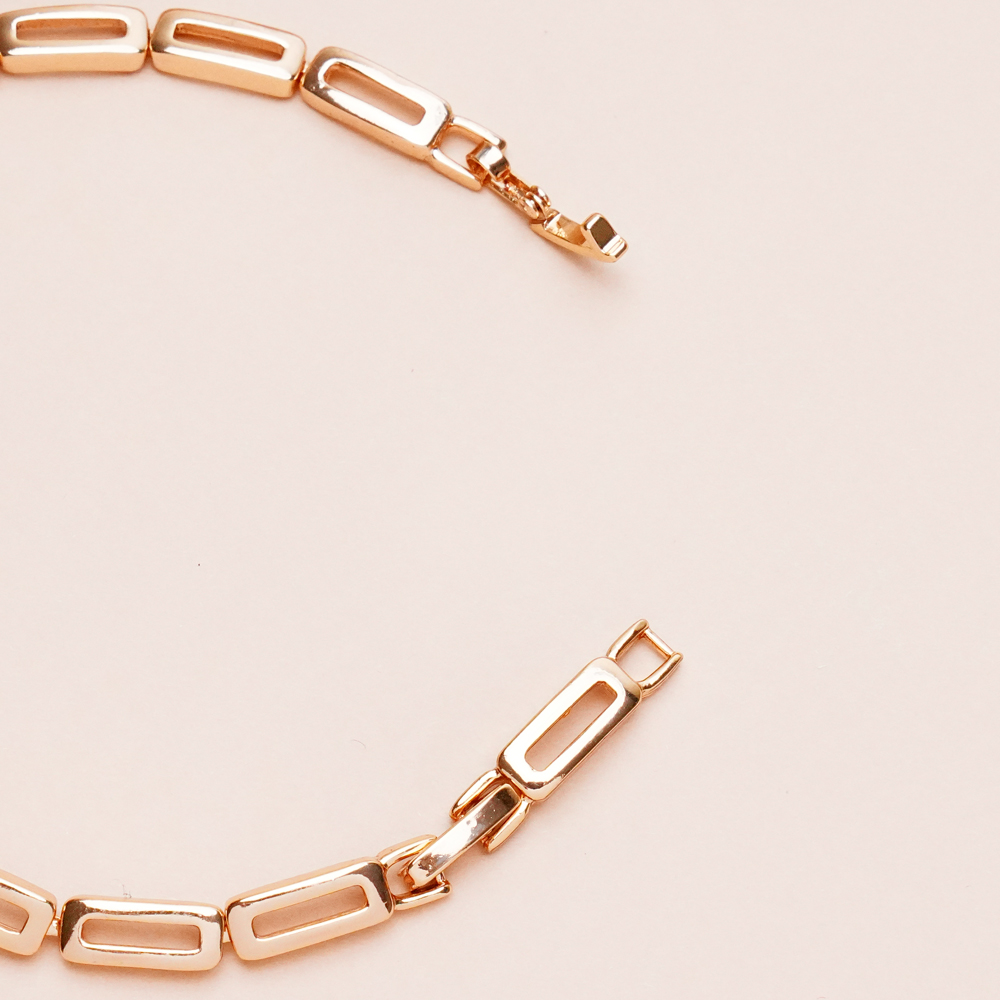 رنگ طلایی براق در کنار فرم ظریف و ساختار منظم دستبند، باعث میشود این مدل هم بهتنهایی بدرخشد و هم در کنار ساعت یا سایر اکسسوریها جلوهای شیک ایجاد کند. این دستبند برای مهمانیها، مراسم و هدیه دادن انتخابی بسیار شایسته است.