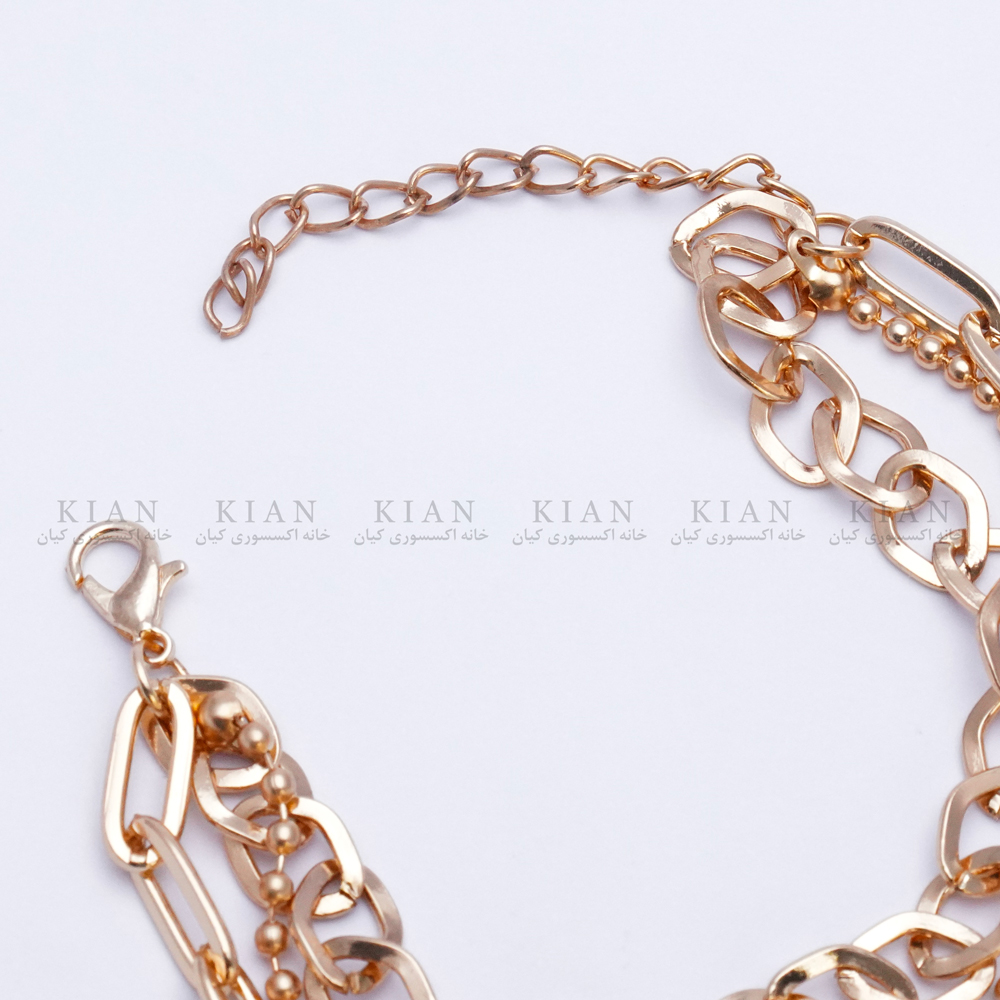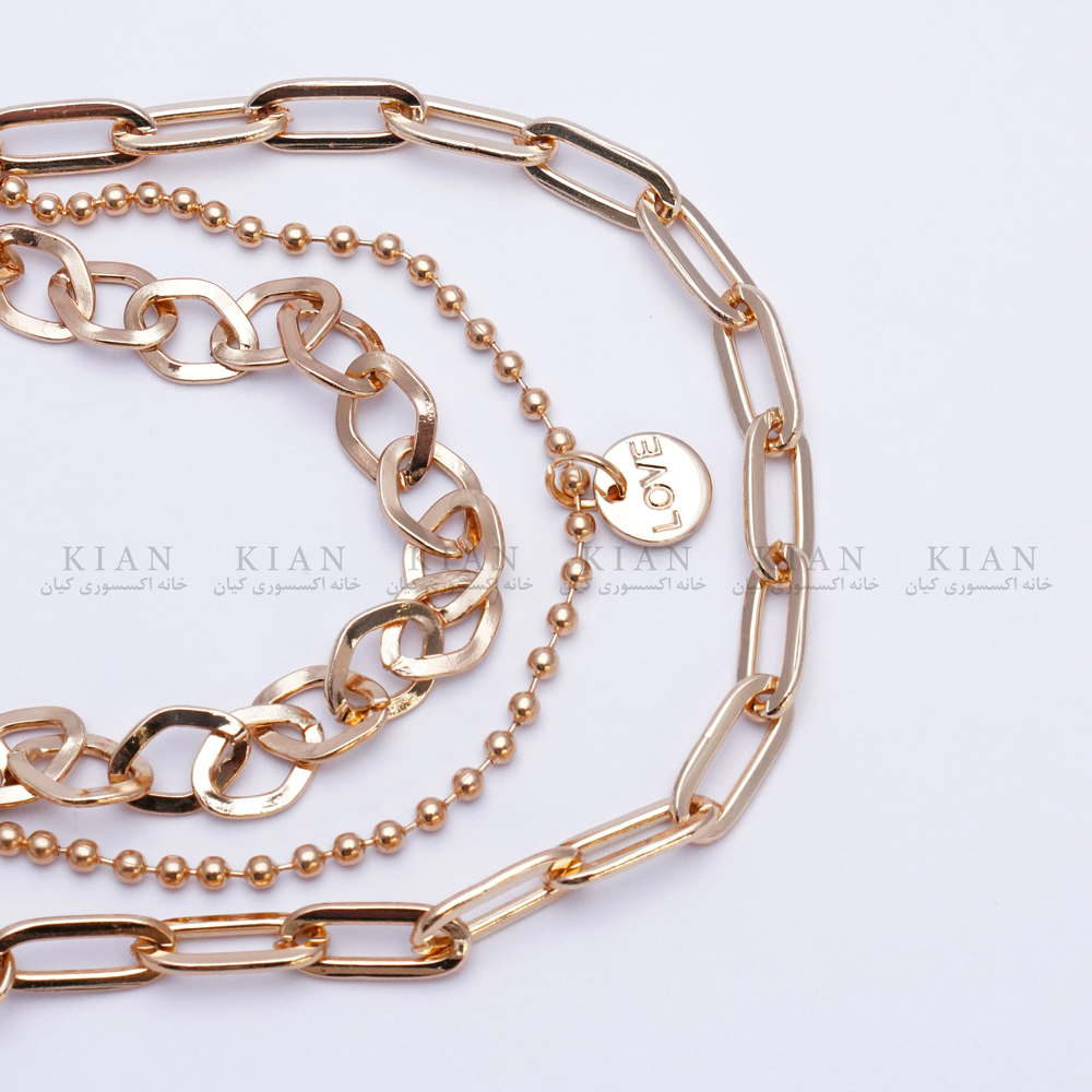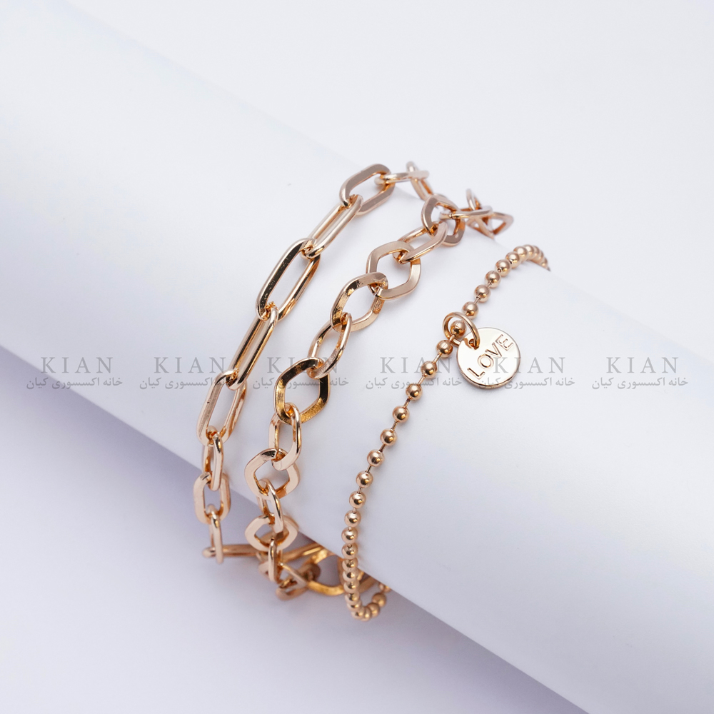 این تصویر یک ست دستبند زنانه به رنگ رزگلد را نشان می‌دهد که شامل سه مدل مختلف است. یکی از دستبندها دارای زنجیر درشت با طراحی خاص، دیگری زنجیری با حلقه‌های کوچک و متوسط، و سومی یک دستبند مهره‌ای ظریف با آویز قلبی‌شکل که روی آن کلمه LOVE حک شده است. این ست ترکیبی از استایل کلاسیک و مدرن بوده و برای استفاده روزمره یا استایل‌های رسمی و مجلسی مناسب می باشد