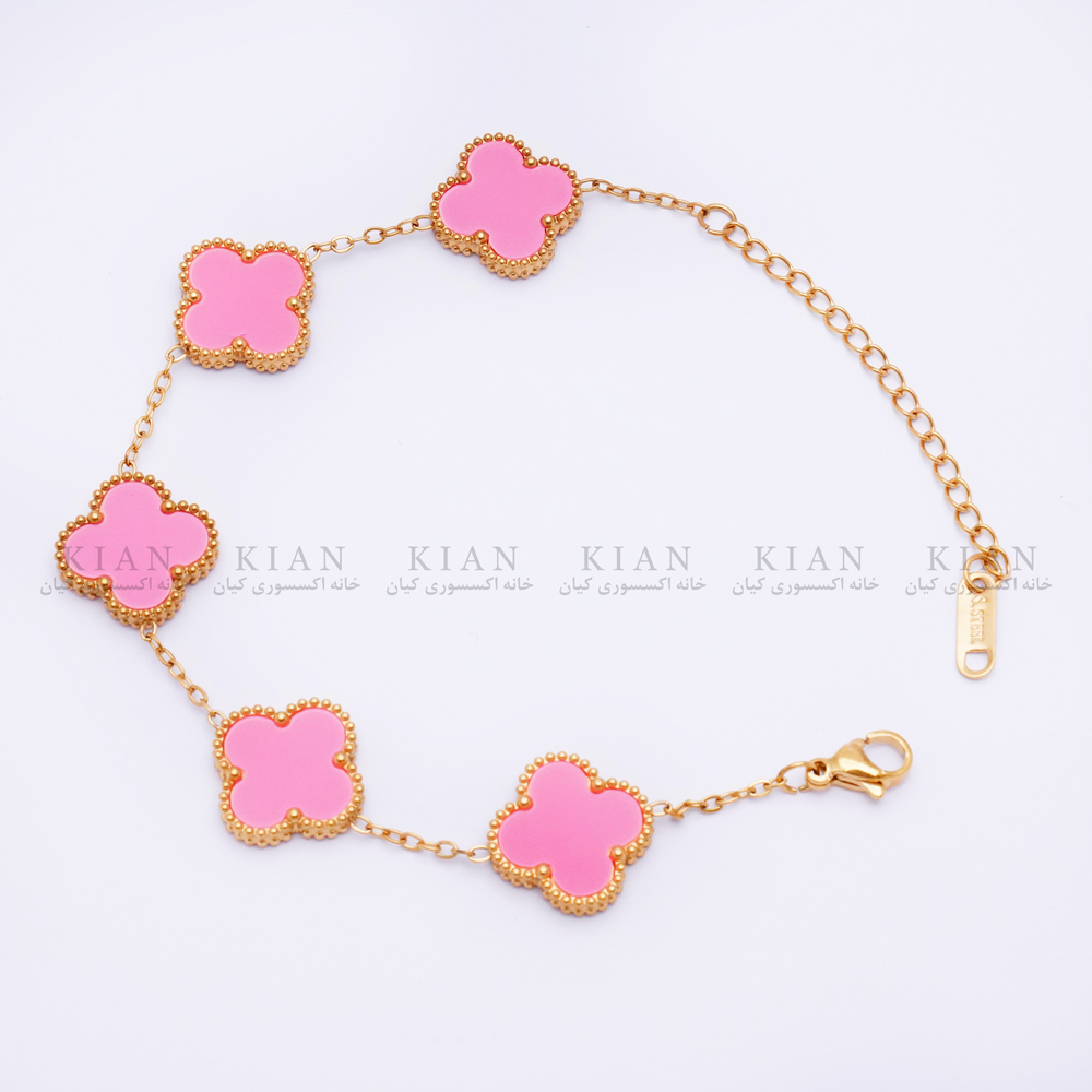 دستبند ونکلیف صورتی طلایی یکی از خاصترین مدلهای مجموعهی خانه اکسسوری کیان است. ترکیب رنگ ملایم صورتی با زنجیر طلایی براق، جلوهای زنانه، لطیف و بسیار شیک ایجاد کرده است. طراحی الهامگرفته از برند لوکس Van Cleef این دستبند را به گزینهای ایدهآل برای استایلهای مجلسی، دخترانه و هدیهای خاص تبدیل کرده است.