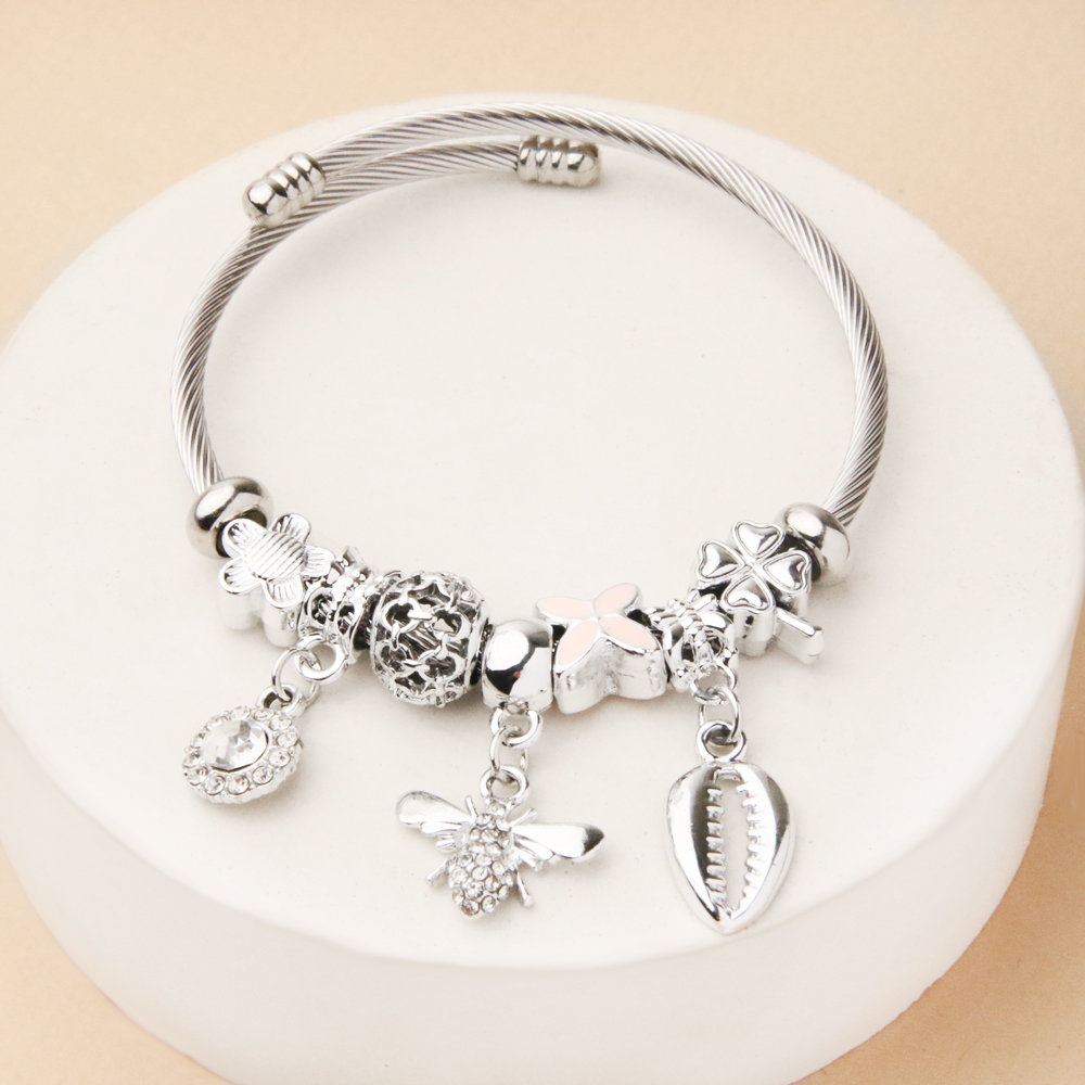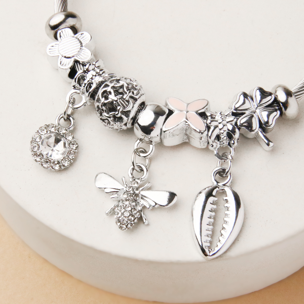دستبند پاندورا زنبور یکی از مدلهای خاص و الهامگرفته از طبیعت در خانه اکسسوری کیان است که با آویز ظریف زنبور، نماد تلاش، انرژی و نظم را به استایل شما اضافه میکند. در کنار آویز زنبور، مهرهها و آویزهای نقرهایرنگ براق قرار گرفتهاند که جلوهای شیک، متعادل و چشمنواز به دستبند بخشیدهاند.