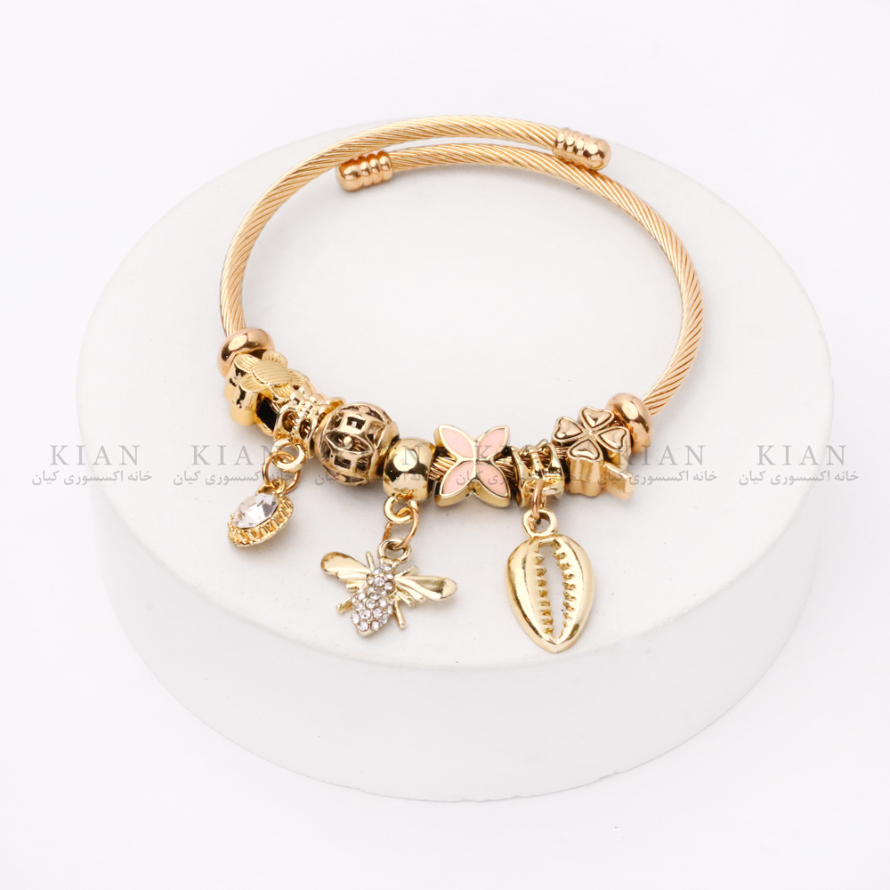 آویز زنبور با طراحی ظریف و درخشش ملایم خود، نقطهی اصلی توجه این دستبند است و نماد سختکوشی، انرژی و زیبایی طبیعی محسوب میشود. در کنار آن، صدف و ستاره حس تابستان، ساحل و آزادگی را به مدل اضافه میکنند و ترکیبی کاملاً دلنشین میسازند.