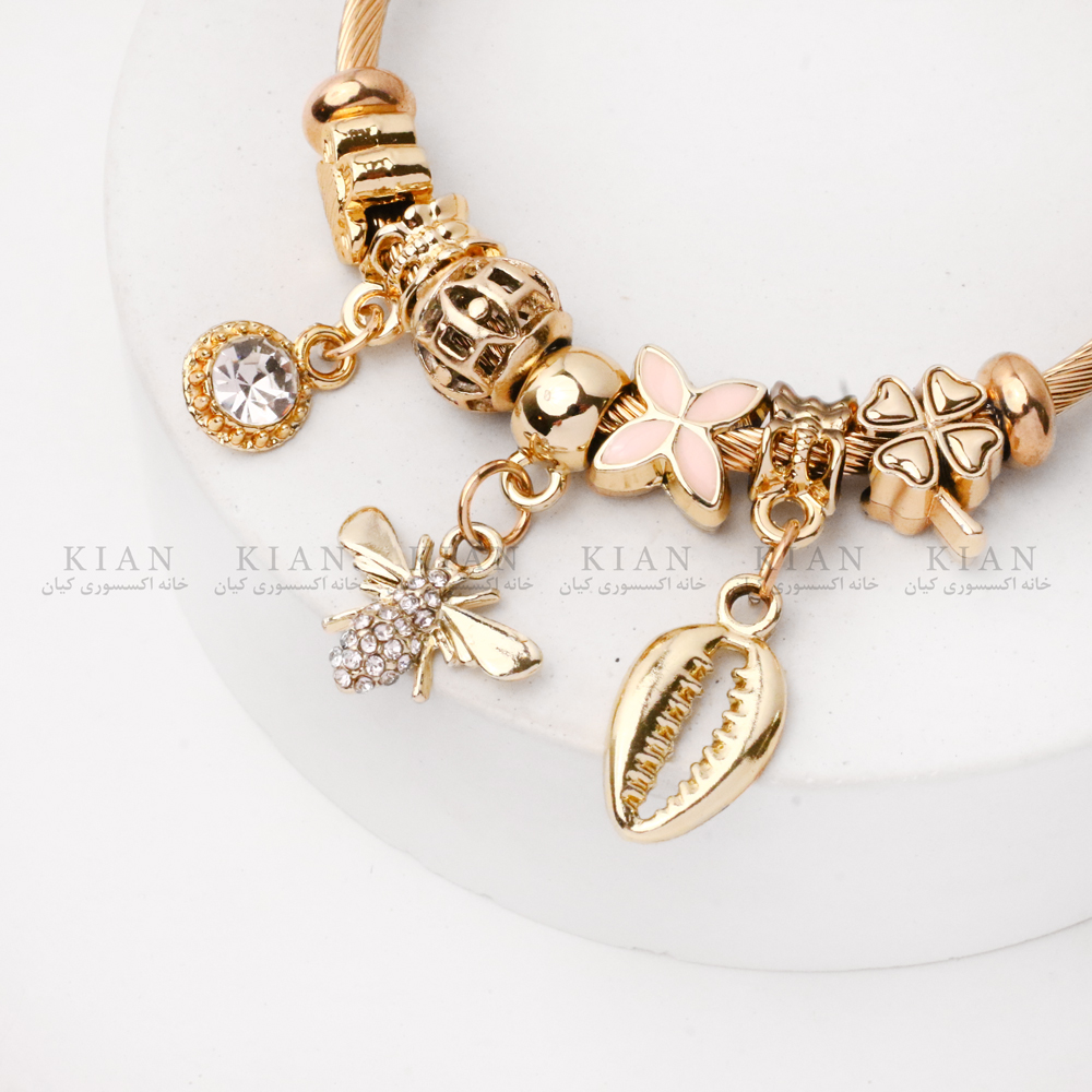 دستبند پاندورا زنبور طلایی یکی از خاصترین و محبوبترین مدلهای مجموعه زیورآلات خانه اکسسوری کیان است. این دستبند با ترکیب جذاب مهرههای طلایی، نگیندار و طرحدار در کنار آویزهای فانتزی و نمادین مثل زنبور، ستاره و صدف، استایلی شیک، دخترانه و طبیعتالهامشده ایجاد کرده است.