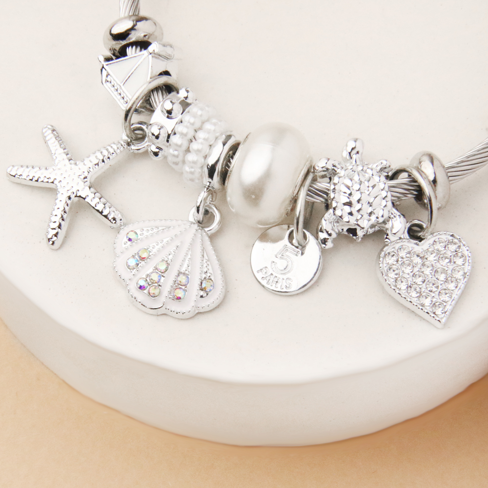 دستبند پاندورا ستاره دریایی از مدلهای الهامگرفته از دنیای آرام و زیبای دریا در خانه اکسسوری کیان است. آویز ظریف ستاره دریایی در کنار آویزهای صدفی و مهرههای نقرهایرنگ براق، ترکیبی لطیف و چشمنواز ایجاد کرده که حس آرامش و استایل تابستانی را به دستان شما میبخشد.
