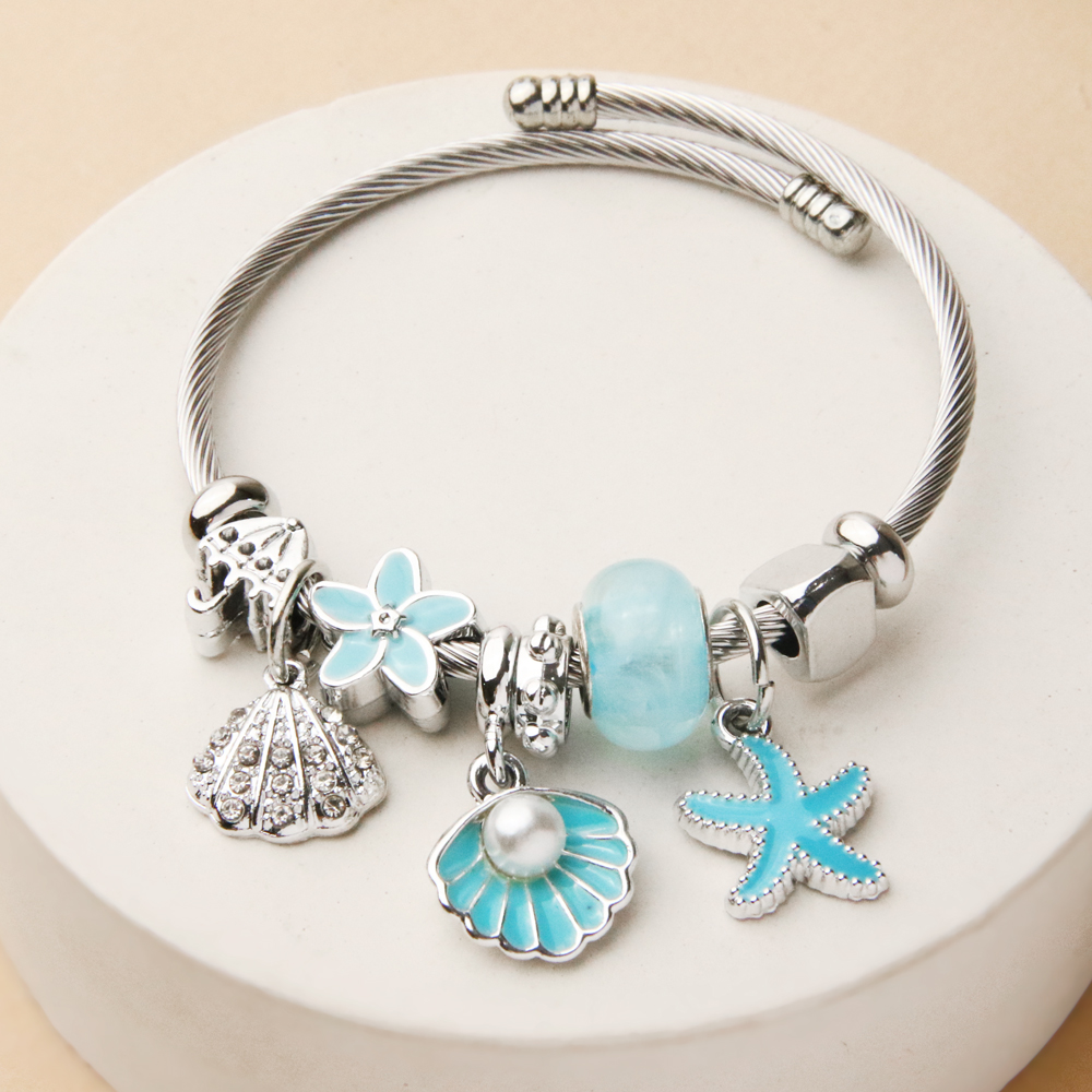 دستبند پاندورا صدف آبی از مجموعه زیورآلات الهامگرفته از دریا خانه اکسسوری کیان، نمادی از آرامش، پاکی و انرژی مثبت است. طراحی زیبا با آویز صدف آبی و مهرههای هماهنگ، حس طراوت و خنکی دریا را به استایل شما منتقل میکند.
