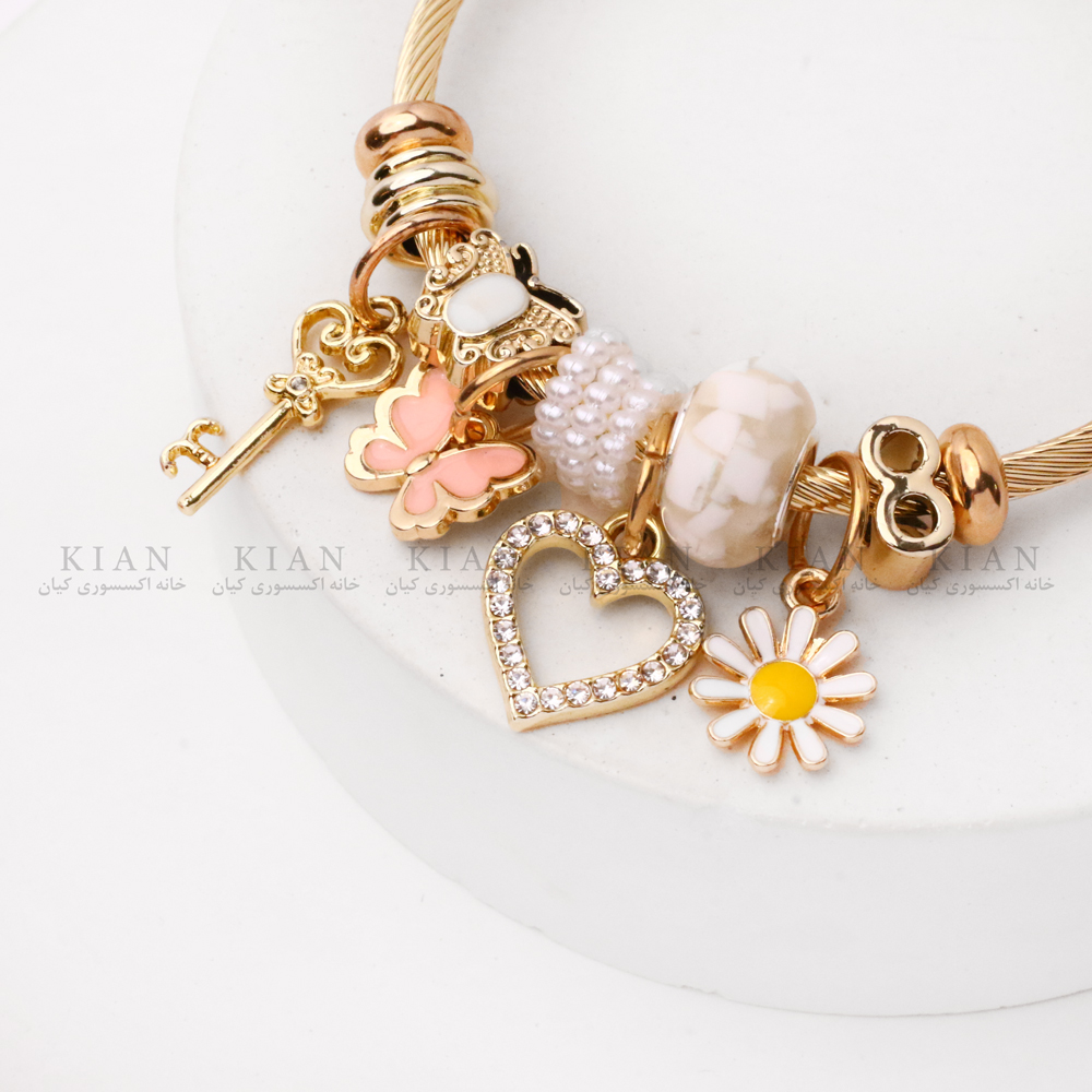 آویز بابونه سفید که نماد تازگی، شادی و حس طبیعت است، مرکز جذابیت این دستبند محسوب میشود. در کنار آن، آویزهای قلب، کلید و مهرههای نگیندار به مدل شخصیت بیشتری میدهند و آن را به گزینهای خاص برای استایلهای روزمره و فانتزی تبدیل میکنند.