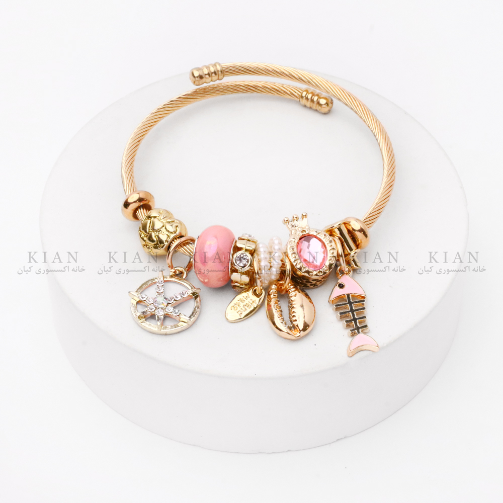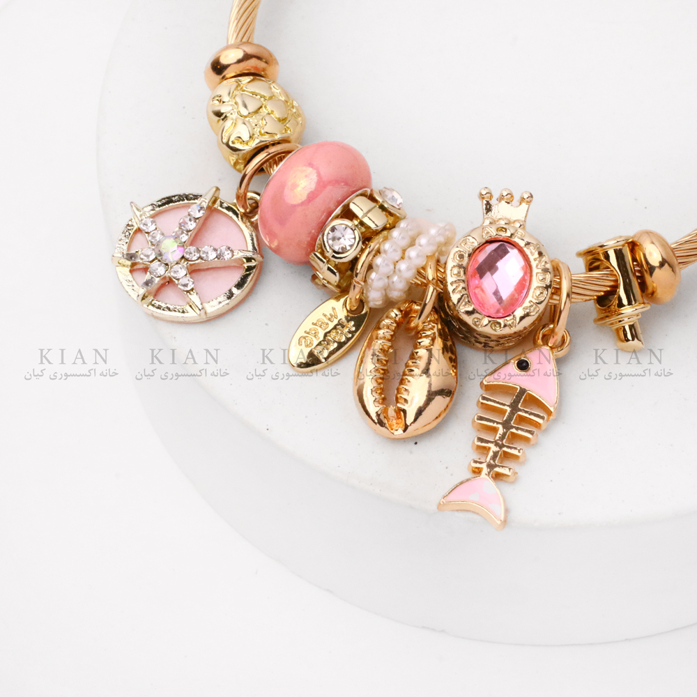 این دستبند با یک فریم طلایی براق و مقاوم طراحی شده و روی آن مجموعه‌ای از آویزهای زیبا قرار گرفته است. آویز تیغ ماهی طلایی که نماد ظرافت و منحصر‌به‌فرد بودن است، نقطه‌ی اصلی تمرکز این دستبند محسوب می‌شود. در کنار آن، آویزهای جذاب دیگری مانند قلب صورتی درخشان، بستنی مینیاتوری، و مهره‌های گل‌گون صورتی قرار دارند که ترکیبی فوق‌العاده شیک، جوان‌پسند و پرجزئیات می‌سازند.