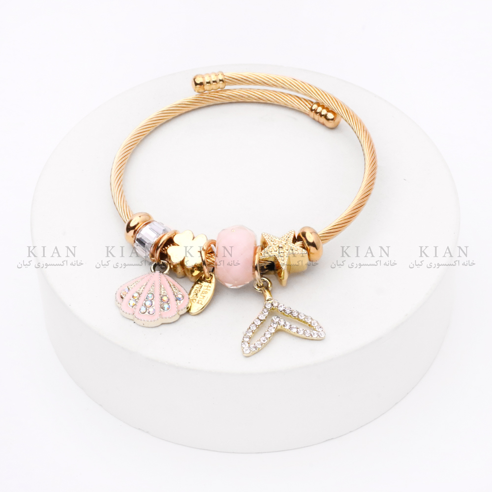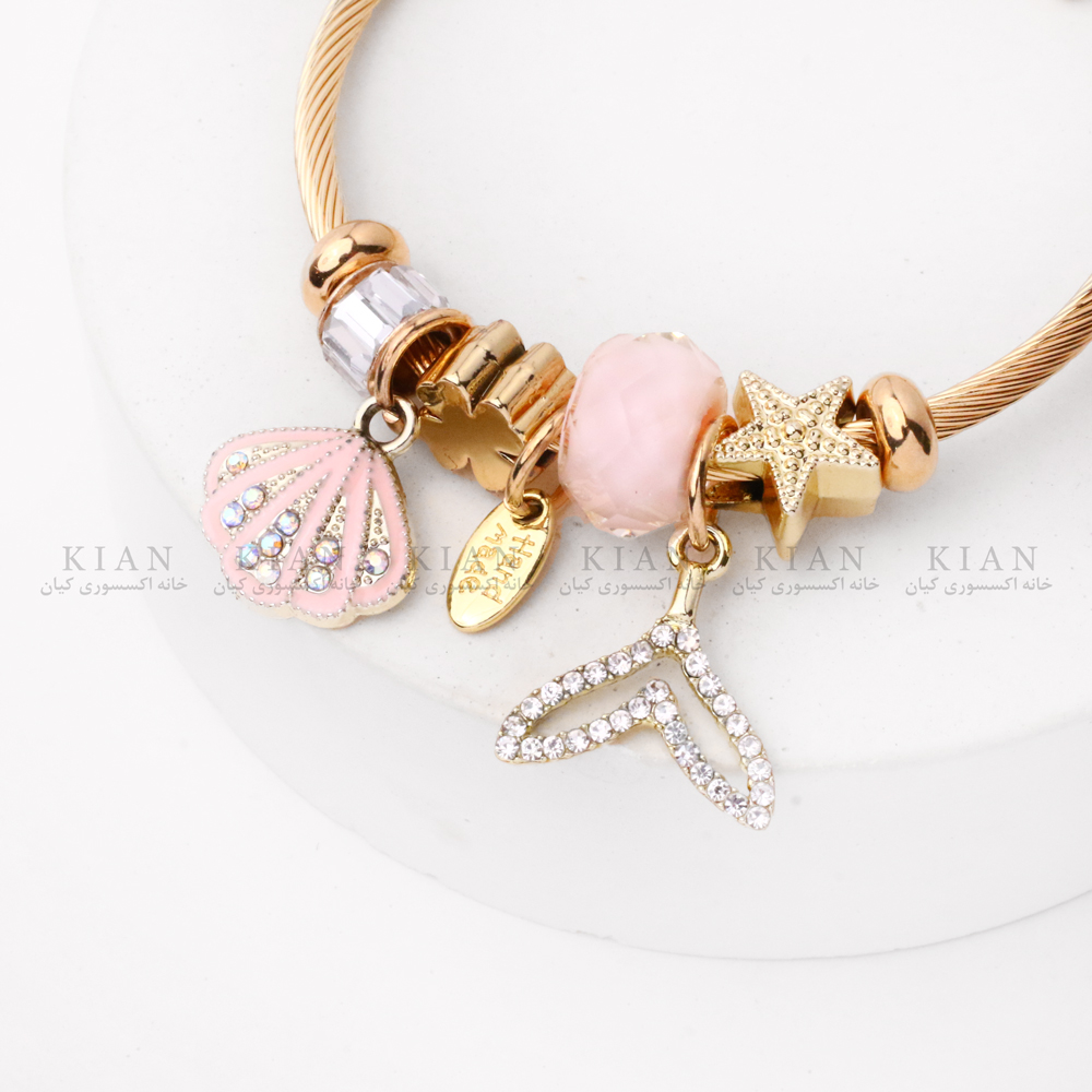 دستبند پاندورا طلایی صدف صورتی یک مدل ظریف، دخترانه و بسیار شیک است که با ترکیب رنگ طلایی و صورتی، استایلی لطیف و دلنشین ایجاد می‌کند. آویزهای زیبای این مدل شامل صدف صورتی طرح‌دار و دم‌وال طلایی ظریف هستند که همراه با مهره‌های صورتی و طلایی، طراحی دستبند را کامل می‌کنند.