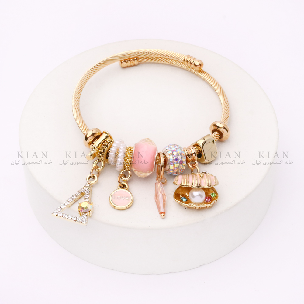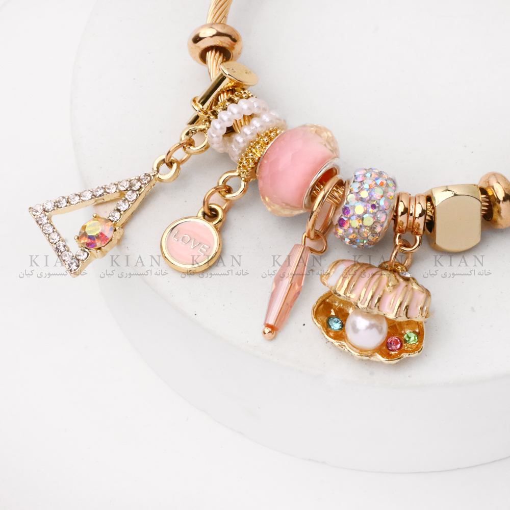 دستبند پاندورا طلایی صدف مرواریدی یک مدل شیک و ظریف است که با ترکیب آویزهای صدفی و مرواریدی، جلوه‌ای دلنشین و زنانه ایجاد می‌کند. آویز صدف طلایی مرواریدی به‌همراه پلاک‌های طلایی و مهره‌های صورتی و نگین‌دار طراحی این مدل را کامل کرده و آن را به انتخابی خاص تبدیل کرده است.
