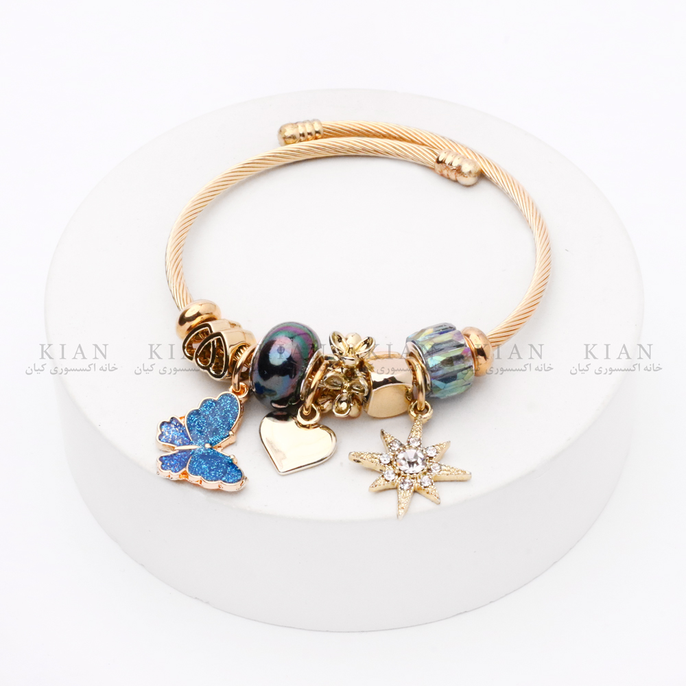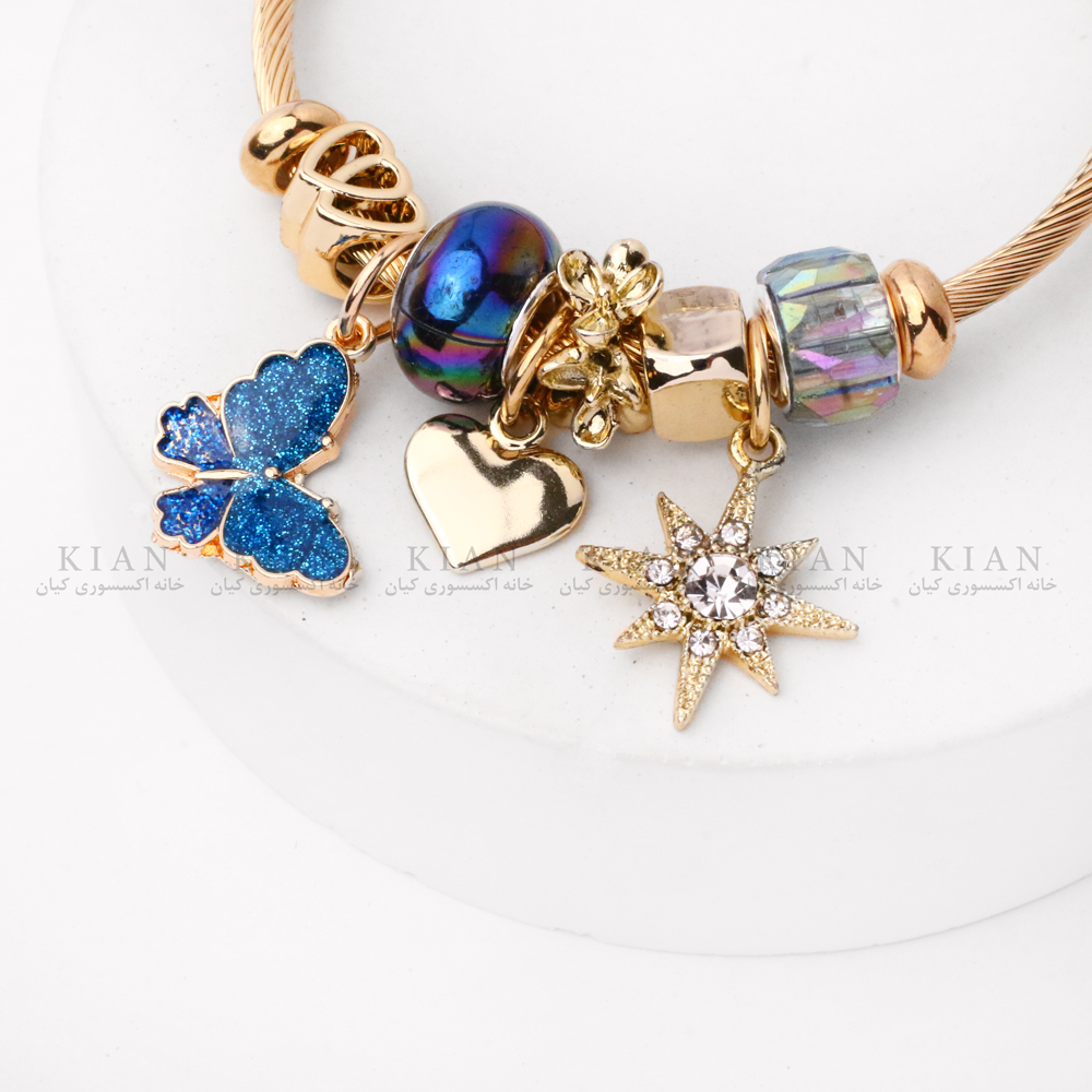این مدل از یک فریم طلایی براق و مقاوم ساخته شده که با چندین مهره و آویز زیبا تزئین شده است. آویز پروانه آبی در مرکز توجه این دستبند قرار دارد؛ پروانهای با رنگ آبی شفاف که حس آزادی، لطافت و زیبایی را به استایل شما اضافه میکند. در کنار آن، آویزهای دیگری مانند قلب طلایی براق و گل طلایی ظریف قرار گرفتهاند که به این دستبند جلوهای متفاوت و پُر از جزئیات میبخشند.