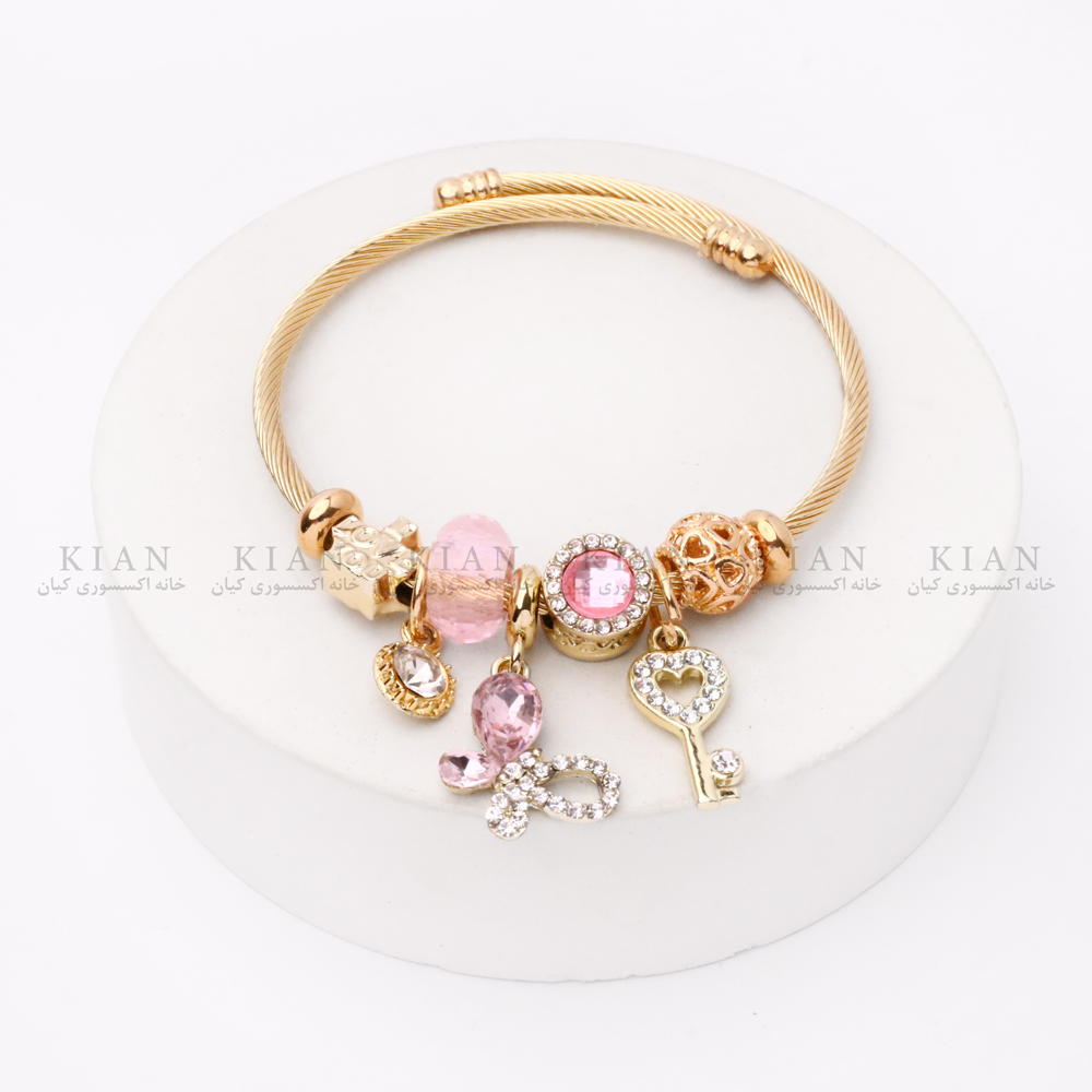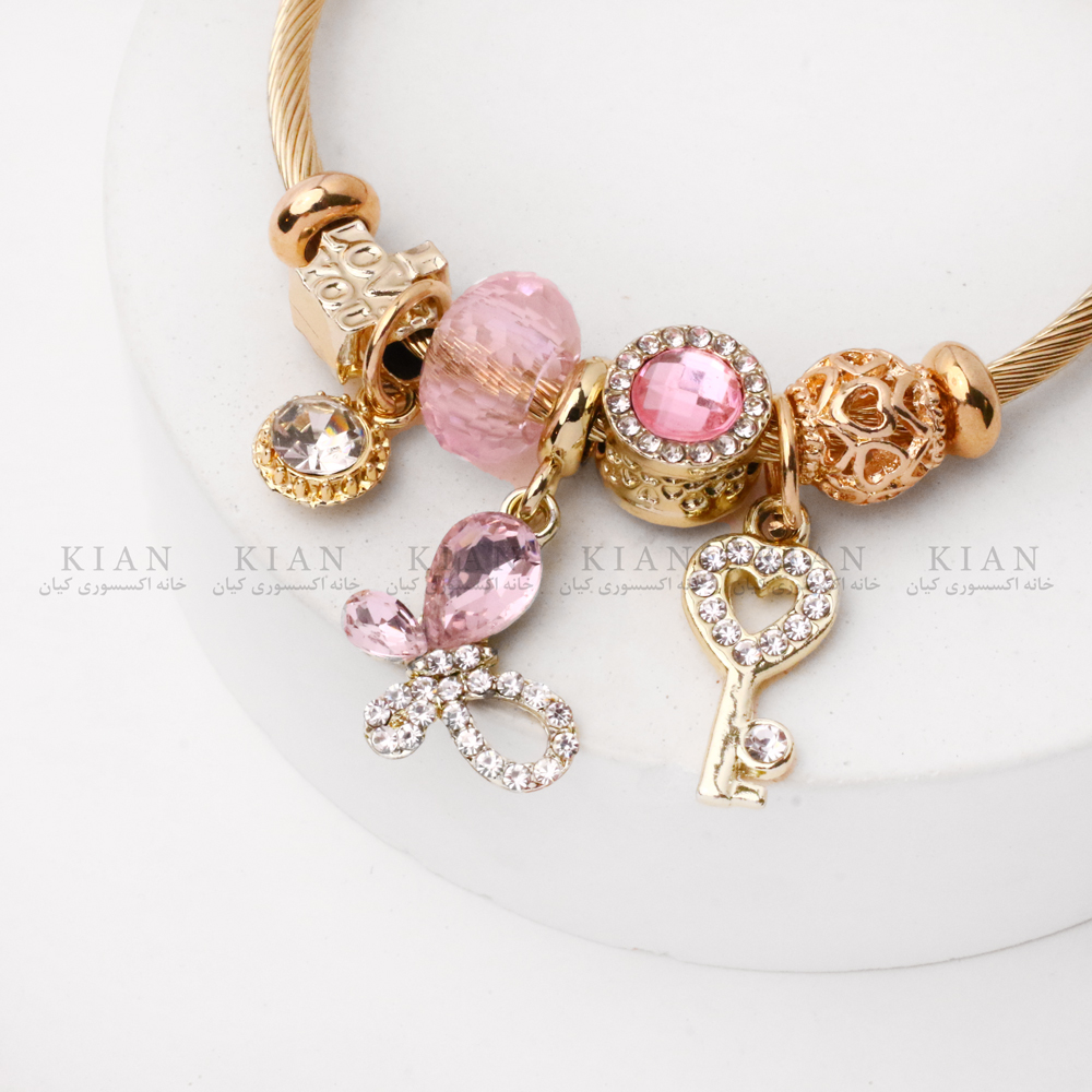 دستبند پاندورا طلایی کلید قلبی مدلی شیک و رمانتیک است که با آویز کلید قلبی طلایی صورتی جلوهای ظریف و دخترانه ایجاد میکند. کنار آن، آویزهای قلب صورتی نگیندار و پلاک طلایی کوچک همراه با مهرههای صورتی و طلایی، زیبایی این دستبند را کامل کردهاند.