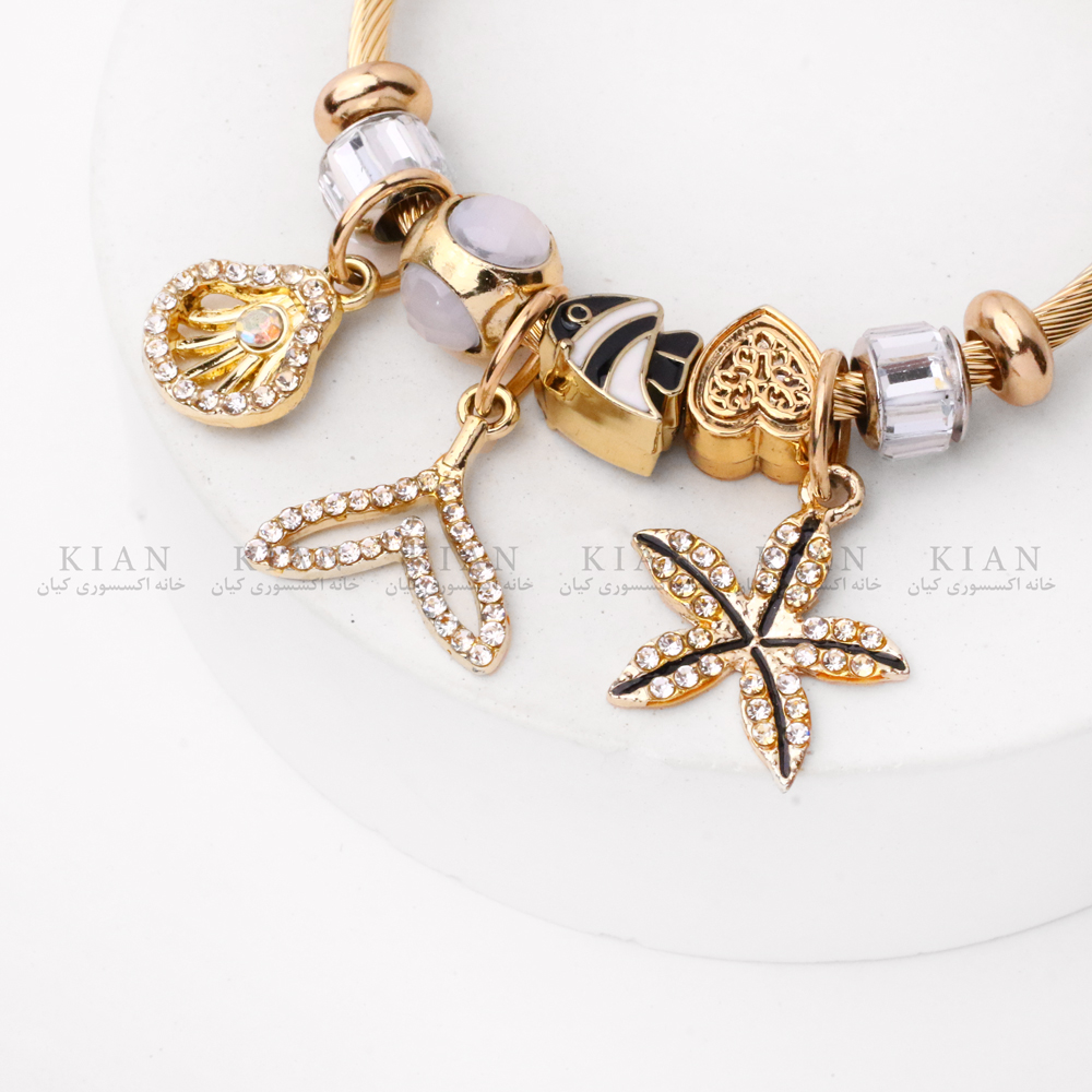 دستبند پاندورا طلایی گل نگیندار مدلی شیک و چشمنواز است که با آویز گل طلایی نگیندار جلوهای ظریف و زنانه ایجاد میکند. در کنار آن، آویزهای پلاک قلبی، حرف F طلایی و ستاره زیبا بههمراه مهرههای طوسی، طلایی و نگیندار، ترکیب جذاب این مدل را کامل کردهاند.