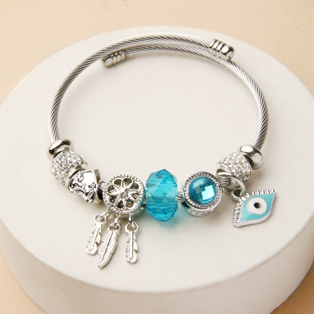 ترکیب رنگ آبی درخشان با بدنهی نقرهای براق، جلوهای شیک و دلنشین به این دستبند بخشیده و آن را به گزینهای مناسب برای استفاده روزمره یا هدیهای پرمعنا تبدیل کرده است. این مدل بهراحتی با سایر اکسسوریها ست میشود و حس امنیت و انرژی مثبت را به استایل شما اضافه میکند.