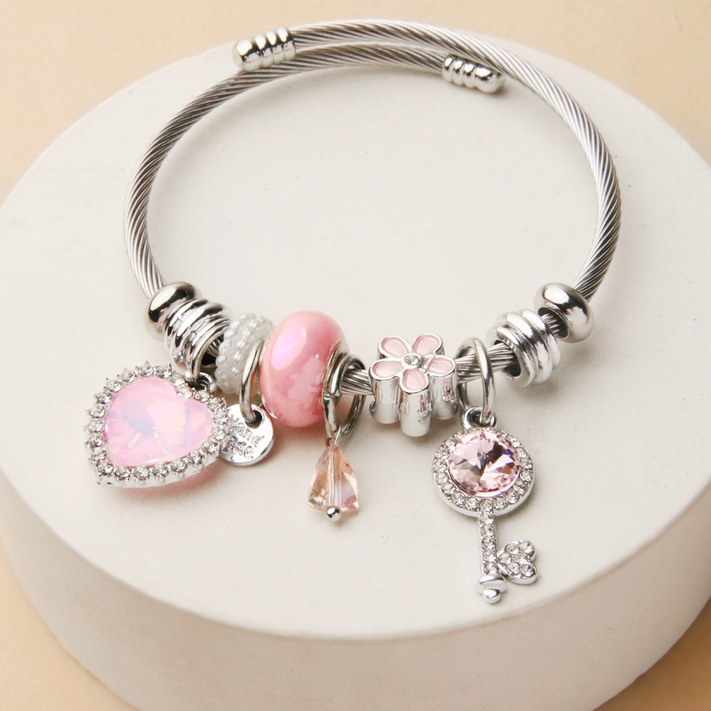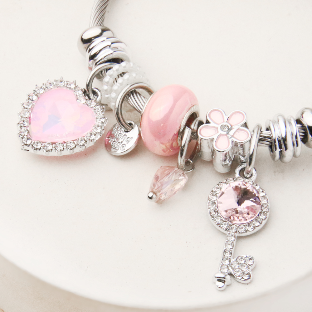 ترکیب رنگ صورتی لطیف با بدنه نقرهای براق، جلوهای دخترانه و دلنشین به این دستبند بخشیده و آن را به انتخابی عالی برای استفاده روزمره یا هدیهای خاص برای عزیزان تبدیل کرده است. طراحی پاندورایی این مدل امکان ست شدن آسان با سایر اکسسوریها را فراهم میکند.